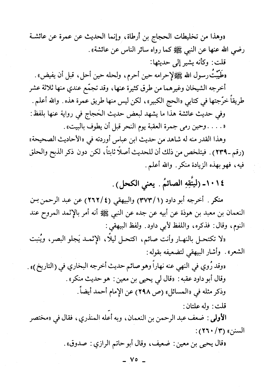 " لا تكتحل بالنهار وأنت صائم، اكتحل ليلا، الإثمد يجلوالبصر، وينبت الشعر "، وأشار البيهقي لتضعيفه بقوله: