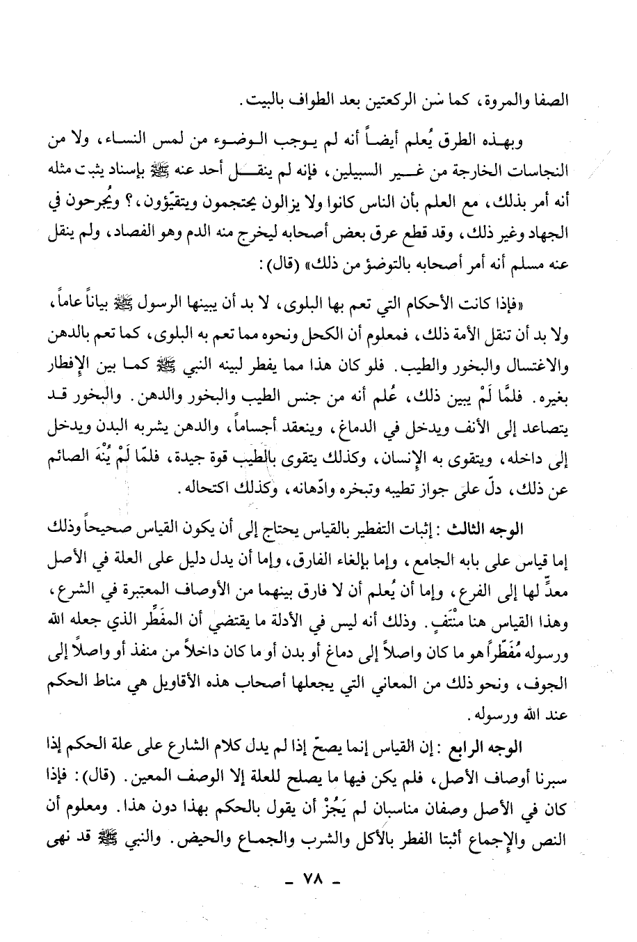 الوجه الثالث: إثبات التفطير بالقياس يحتاج إلى أن يكون القياس صحيحا وذلك إما قياس على بابه الجامع، وإما بإلغاء الفارق، وإما أن يدل دليل على العلة في الأصل معد لها إلى الفرع، وإما أن يعلم أن لا فارق بينهما من الأوصاف المعتبرة في الشرع، وهذا القياس هنا منتف. وذلك أنه ليس في الأدلة ما يقتضي أن المفطر الذي جعله الله ورسوله مفطرا هو ما كان واصلا إلى دماغ أو بدن أو ما كان داخلا من منفذ أوواصلا إلى الجوف، ونحوذلك من المعاني التي يجعلها أصحاب هذه الأقاويل هي مناط الحكم عند الله ورسوله.
