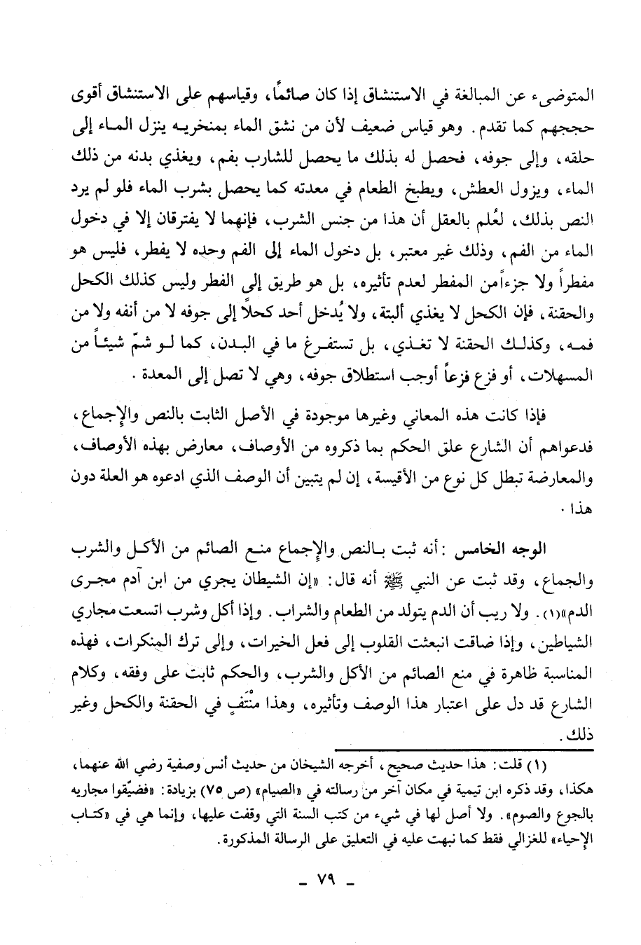 الوجه الخامس: أنه ثبت بالنص والإجماع منع الصائم من الأكل والشرب والجماع، وقد ثبت عن النبي صلى الله عليه وسلم أنه قال: " إن الشيطان يجري من ابن آدم مجرى الدم " (1) . ولا ريب أن الدم يتولد من الطعام والشراب. وإذا أكل وشرب اتسعت مجاري الشياطين، وإذا ضاقت انبعثت القلوب إلى فعل الخيرات، وإلى ترك المنكرات، فهذه المناسبة ظاهرة في منع الصائم من الأكل والشرب، والحكم ثابت على وقفه، وكلام الشارع قد دل على اعتبار هذا الوصف وتأثيره، وهذا منتف في الحقنة والكحل وغير