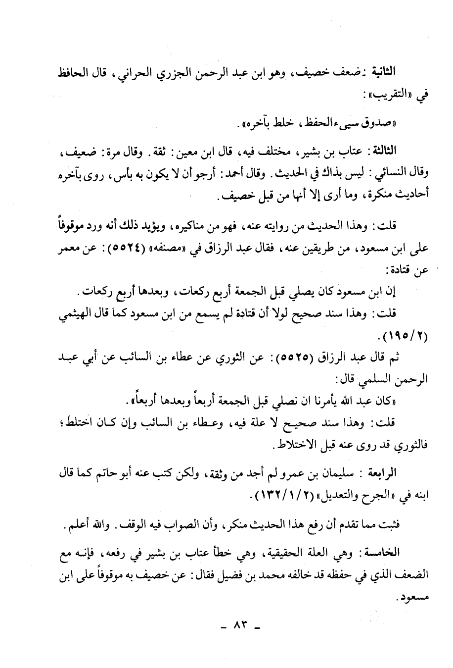 الخامسة: وهي العلة الحقيقية، وهي خطأ عتاب بن بشير في رفعه، فإنه مع الضعف الذي في حفظه قد خالفه محمد بن فضيل فقال: عن خصيف به موقوفا على ابن مسعود.