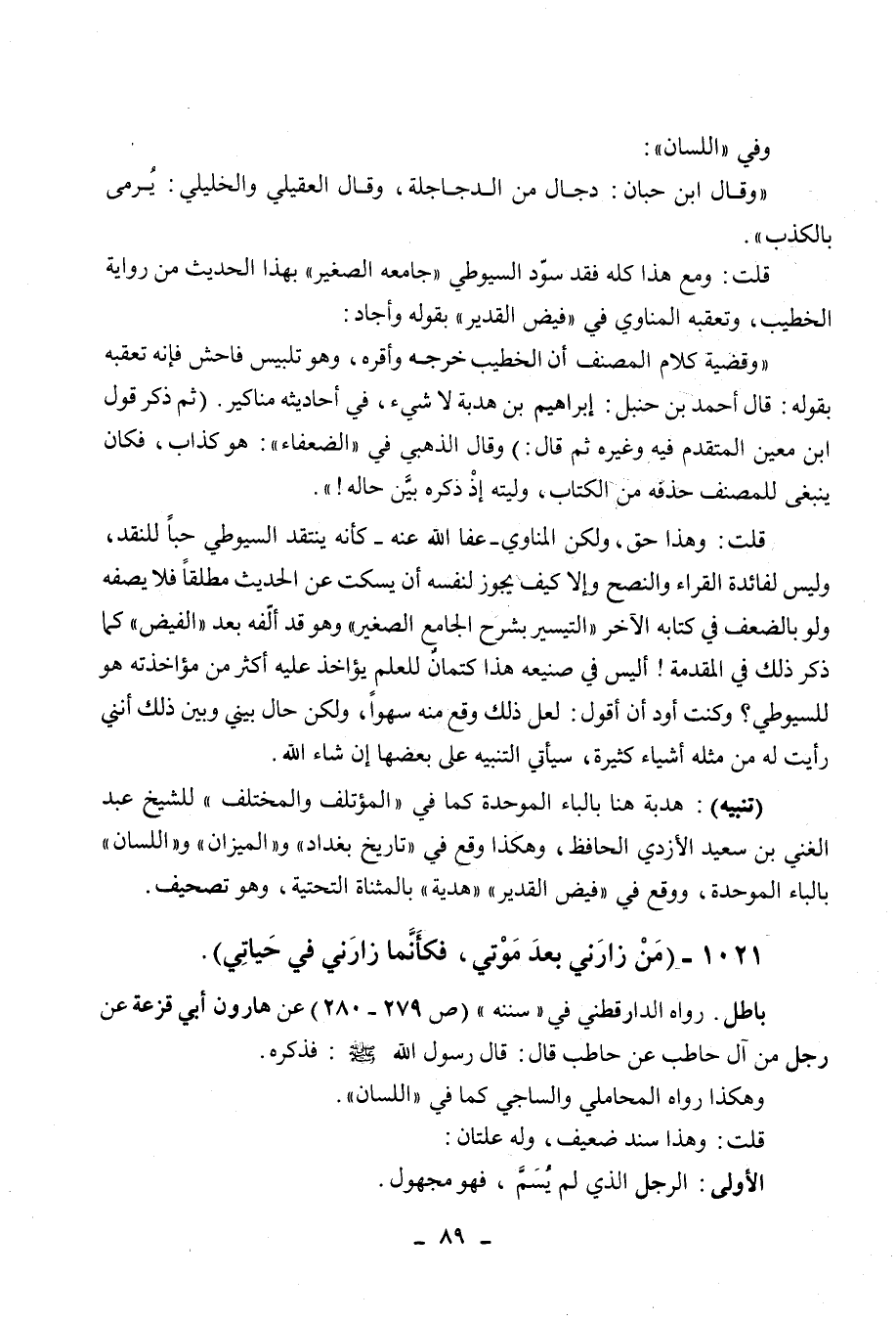 قلت: ومع هذا كله فقد سود السيوطي " جامعه الصغير " بهذا الحديث من رواية الخطيب، وتعقبه المناوي في " فيض القدير " بقوله وأجاد: