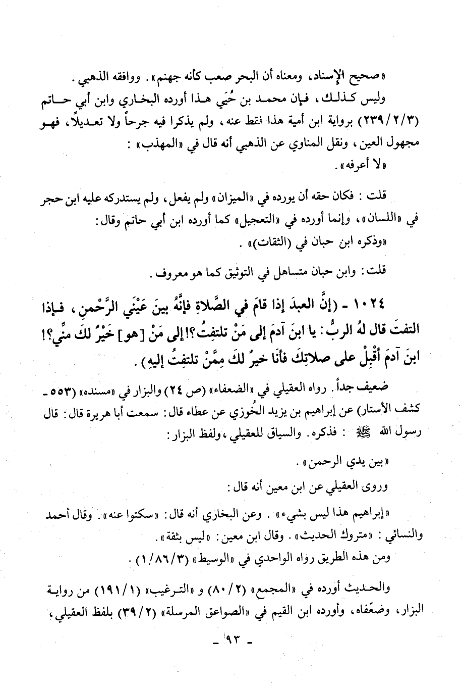 1024 - " إن العبد إذا قام في الصلاة فإنه بين عيني الرحمن، فإذا التفت قال له الرب: يا ابن آدم إلى من تلتفت؟ ! إلى من [هو] خير لك مني؟ ! ابن آدم أقبل على صلاتك فأنا خير لك ممن تلتفت إليه ".