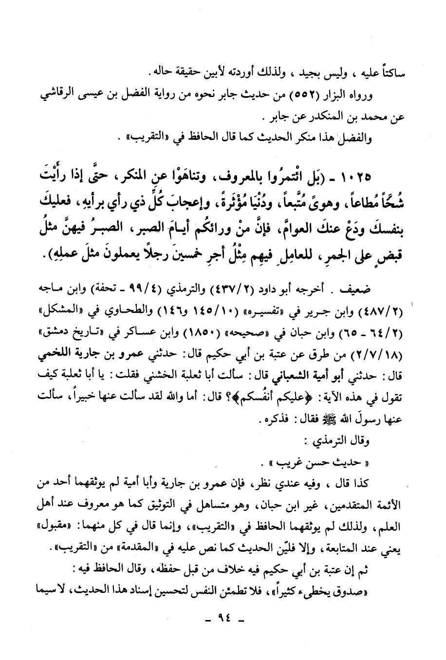 1025 - " بل ائتمروا بالمعروف، وتناهو اعن المنكر، حتى إذا رأيت شحا مطاعا، وهوى متبعا، وإعجاب كل ذي رأي برأيه، فعليك بنفسك ودع عنك العوام، فإن من ورائكم أيام الصبر، الصبر فيهن مثل قبض على الجمر، للعامل فيهم مثل أجر خمسين رجلا يعملون مثل عمله ".