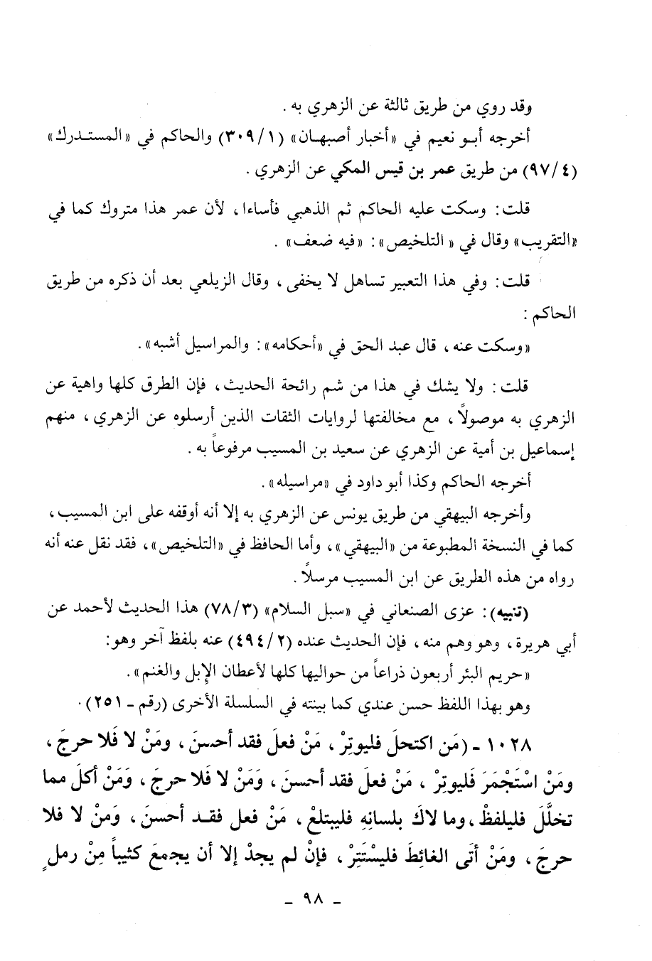1028 - " من اكتحل فليوتر، من فعل فقد أحسن، ومن لا فلا حرج، ومن استجمر فليوتر، من فعل فقد أحسن، ومن لا فلا حرج، ومن أكل مما تخلل فليلفظ، وما لاك بلسانه فليبتلع، من فعل فقد أحسن، ومن لا فلا حرج، ومن أتى الغائط فليستتر، فإن لم يجد إلا أن يجمع كثيبا من رمل