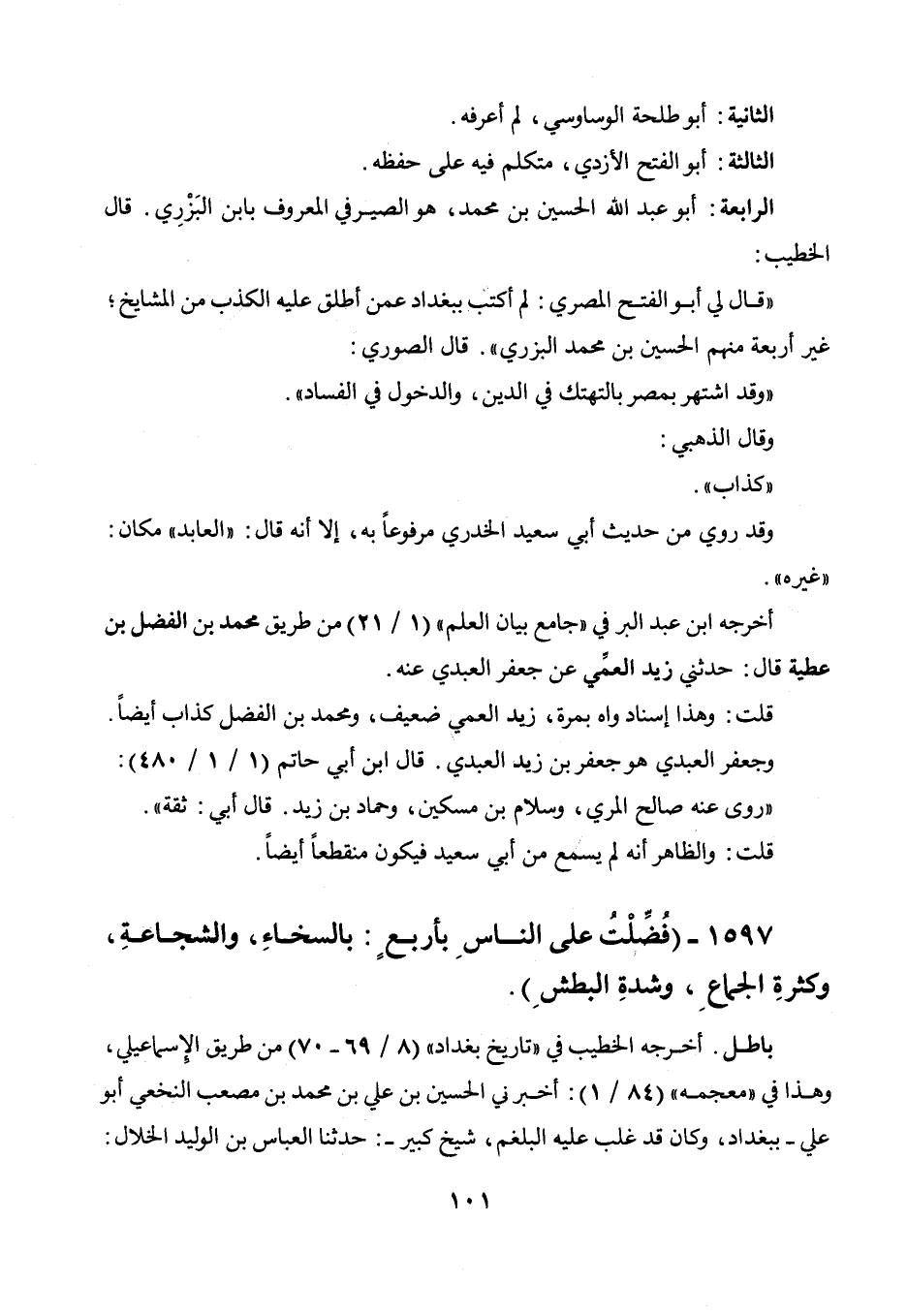 الرابعة: أبو عبد الله الحسين بن محمد، هو الصيرفي المعروف بابن البزري. قال الخطيب: " قال لي أبو الفتح المصري: لم أكتب ببغداد عمن أطلق عليه الكذب من المشايخ، غير أربعة منهم الحسين بن محمد البزري ". قال الصوري: " وقد اشتهر بمصر بالتهتك في الدين، والدخول في الفساد ". وقال الذهبي: " كذاب ". وقد روي من حديث أبي سعيد الخدري مرفوعا به، إلا أنه قال: " العابد " مكان " غيره ".