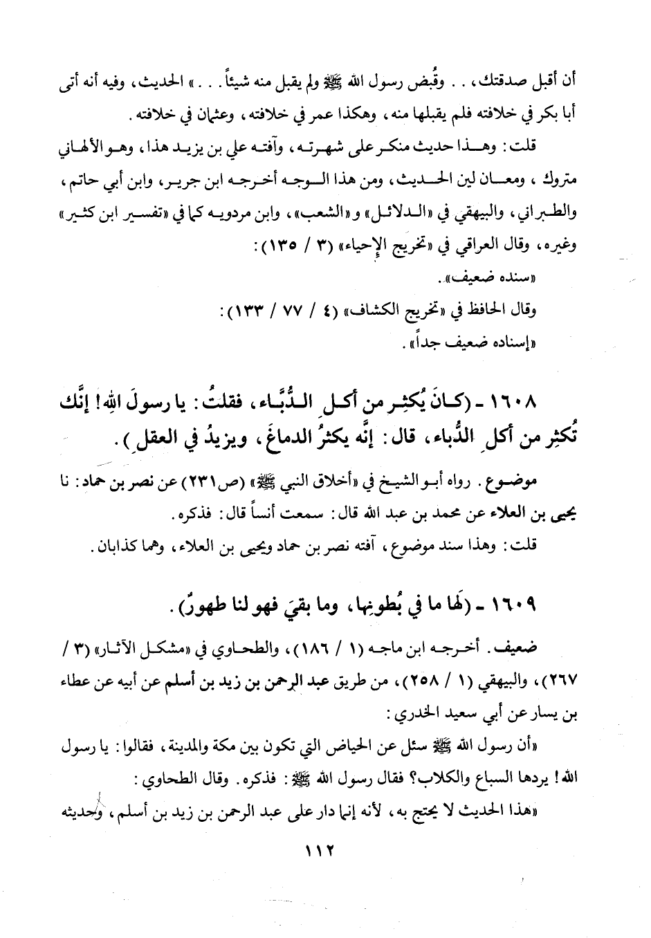 أخرجه ابن ماجة (1 / 186) والطحاوي في " مشكل الآثار " (3 / 267) والبيهقي (1 / 258) من طريق عبد الرحمن بن زيد بن أسلم عن أبيه عن عطاء بن يسار عن أبي سعيد الخدري: " أن رسول الله صلى الله عليه وسلم سئل عن الحياض التي تكون بين مكة والمدينة، فقالوا: يا رسول الله! يردها السباع والكلاب؟ فقال رسول الله صلى الله عليه وسلم: فذكره. وقال الطحاوي: " هذا الحديث لا يحتج به، لأنه إنما دار على عبد الرحمن بن زيد بن أسلم، وحديثه