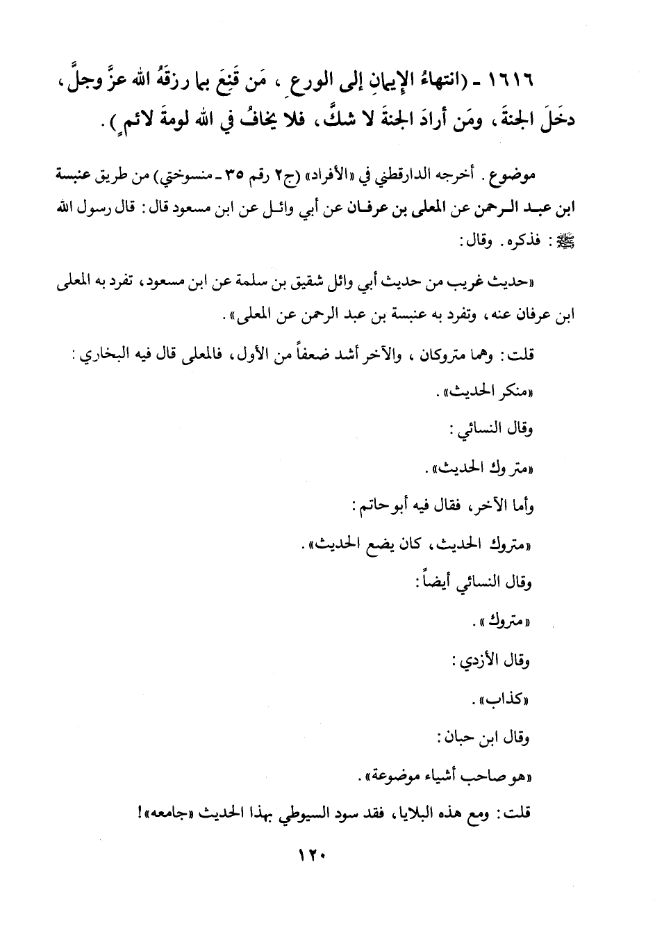 1616 - " انتهاء الإيمان إلى الورع، من قنع بما رزقه الله عز وجل دخل الجنة، ومن أراد الجنة لا شك، فلا يخاف في الله لومة لائم ".