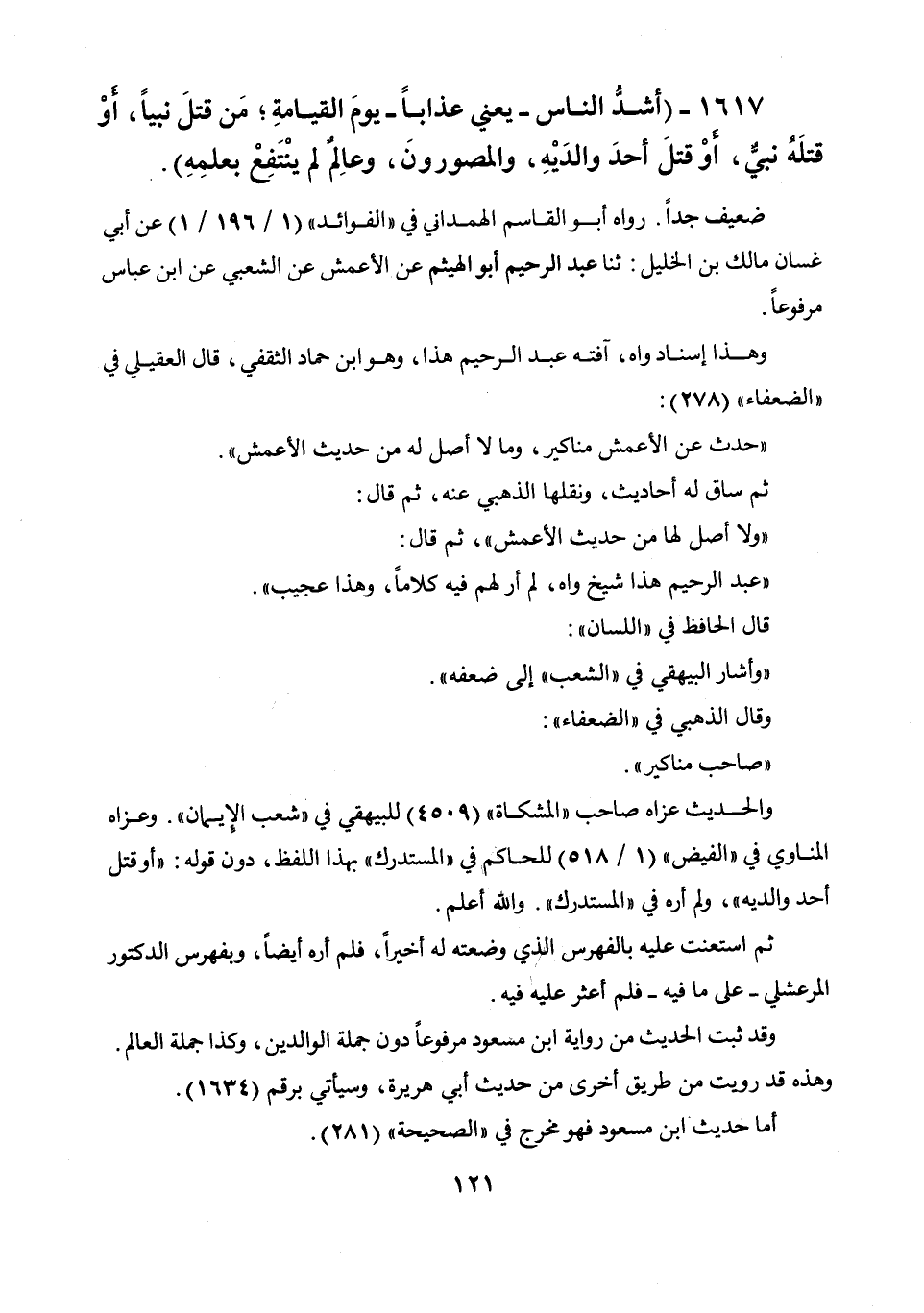 1617 - " أشد الناس - يعني عذابا - يوم القيامة، من قتل نبيا، أوقتله نبي، أوقتل أحد والديه، والمصورون، وعالم لم ينتفع بعلمه ".