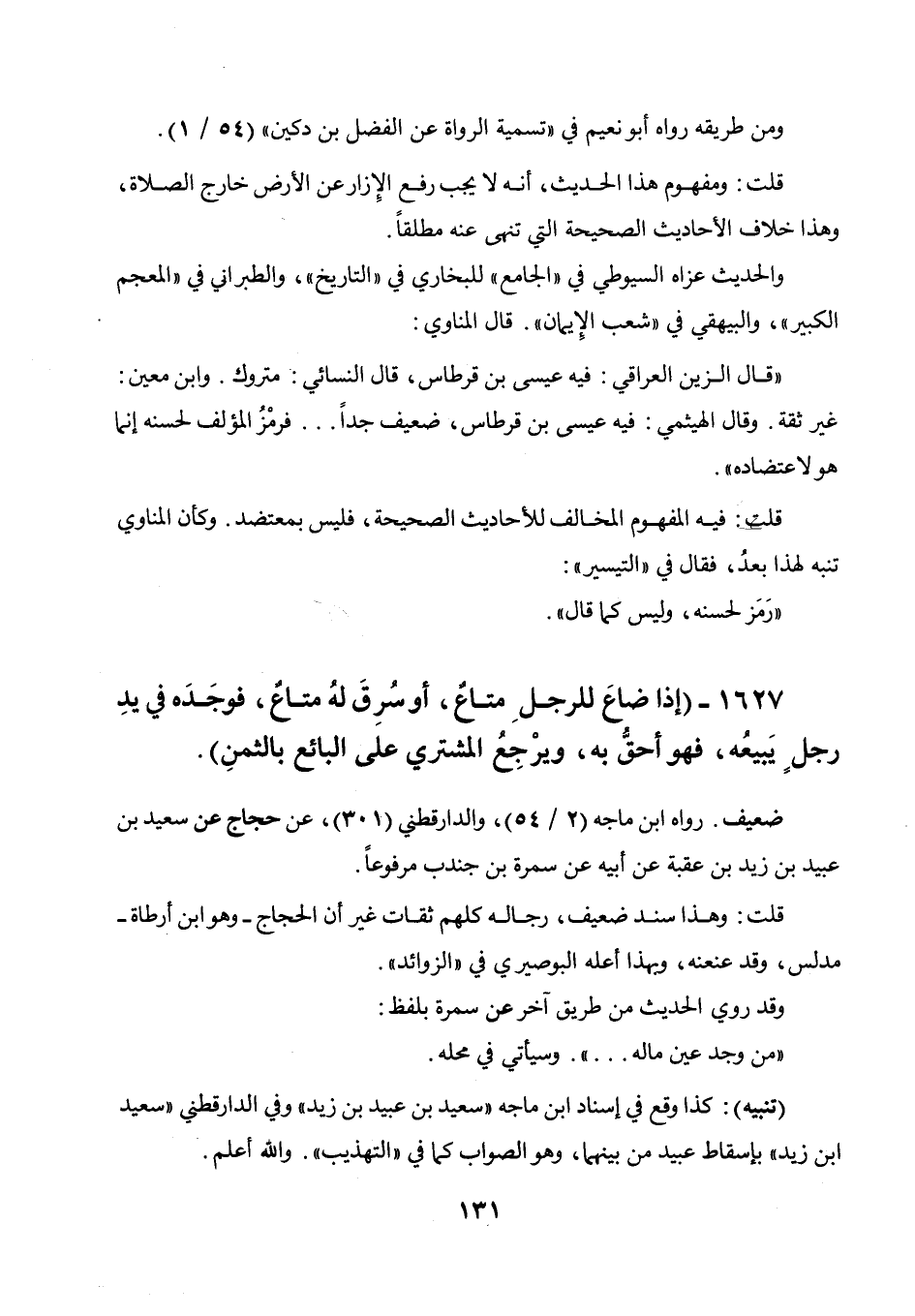ومن طريقه رواه أبو نعيم في " تسمية الرواة عن الفضل بن دكين " (54 / 1) . قلت: ومفهو م هذا الحديث، أنه لا يجب رفع الإزار عن الأرض خارج الصلاة، وهذا خلاف الأحاديث الصحيحة التي تنهى عنه مطلقا. والحديث عزاه السيوطي في " الجامع " للبخاري في " التاريخ "، والطبراني في " المعجم الكبير "، والبيهقي في " شعب الإيمان ".