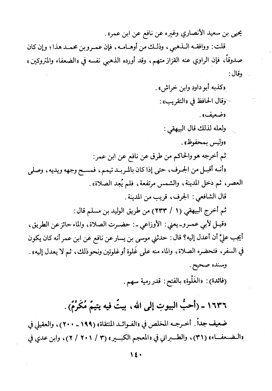 يحيى ابن سعيد الأنصاري وغيره عن نافع عن ابن عمر ". قلت: ووافقه الذهبي، وذلك من أوهامه، فإن عمرو بن محمد هذا، وإن كان صدوقا، فإن الراوي عنه القزاز متهم، وقد أورده الذهبي نفسه في " الضعفاء والمتروكين " وقال: " كذبه أبو داود وابن خراش ". وقال الحافظ في " التقريب ": " ضعيف ". ولعله لذلك قال البيهقي: " وليس بمحفوظ ". ثم أخرجه هو والحاكم من طرق عن نافع عن ابن عمر: " أنه أقبل من الجرف، حتى إذا كان بالمربد تيمم، فمسح وجهه ويديه، وصلى العصر، ثم دخل المدينة، والشمس مرتفعة، فلم يعد الصلاة ". قال الشافعي: الجرف قريب من المدينة. ثم أخرج البيهقي (1 / 233) من طريق الوليد بن مسلم قال: " قيل لأبي عمرو - يعني: الأوزاعي -: حضرت الصلاة، والماء حائز عن الطريق أيجب علي أن أعدل إليه؟ قال: حدثني موسى بن يسار عن نافع عن ابن عمر أنه كان يكون في السفر، فتحضره الصلاة، والماء منه على غلوة أوغلوتين ونحو ذلك، ثم لا يعدل إليه ". وسنده صحيح. (فائدة) : " الغلوة " بالفتح: قدر رمية سهم.