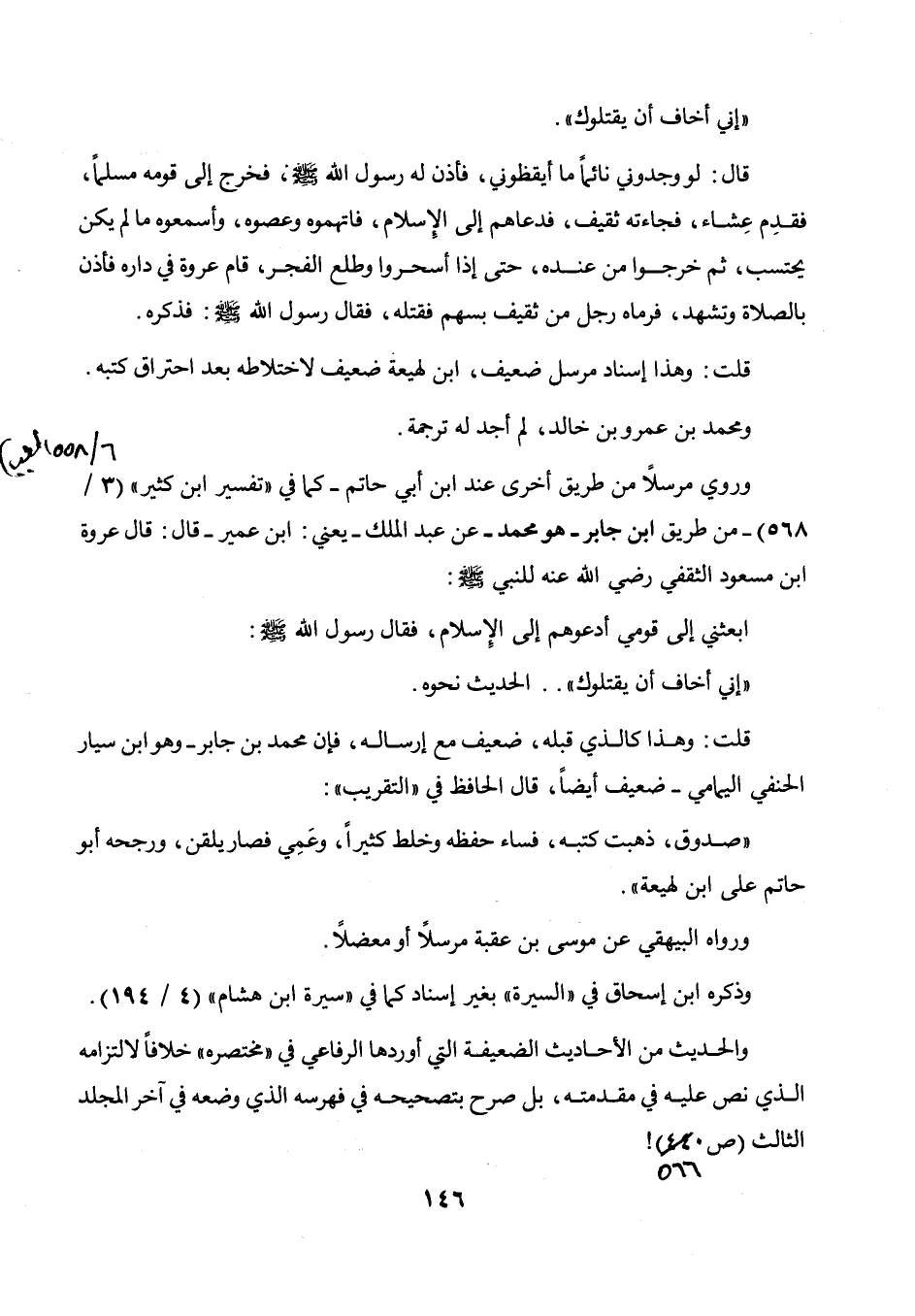 " إني أخاف أن يقتلوك ". قال: لو وجدوني نائما ما أيقظوني، فأذن له رسول الله صلى الله عليه وسلم، فخرج إلى قومه مسلما، فقدم عشاء، فجاءته ثقيف، فدعاهم إلى الإسلام، فاتهموه وعصوه، وأسمعوه ما لم يكن يحتسب، ثم خرجوا من عنده، حتى إذا أسحروا وطلع الفجر، قام عروة في داره فأذن بالصلاة وتشهد، فرماه رجل من ثقيف بسهم فقتله، فقال رسول الله صلى الله عليه وسلم: فذكره. قلت: وهذا إسناد مرسل ضعيف، ابن لهيعة ضعيف لاختلاطه بعد احتراق كتبه. ومحمد بن عمرو بن خالد، لم أجد له ترجمة. وروي مرسلا من طريق أخرى عند ابن أبي حاتم - كما في " تفسير ابن كثير " (3 / 568) - من طريق ابن جابر - هو محمد - عن عبد الملك - يعني: ابن عمير - قال: قال عروة بن مسعود الثقفي رضي الله عنه للنبي صلى الله عليه وسلم: ابعثني إلى قومي أدعوهم إلى الإسلام، فقال رسول الله صلى الله عليه وسلم: " إني أخاف أن يقتلوك ".. الحديث نحوه. قلت: وهذا كالذي قبله، ضعيف مع إرساله، فإن محمد بن جابر - وهو ابن سيار الحنفي اليمامي - ضعيف أيضا، قال الحافظ في " التقريب ": " صدوق، ذهبت كتبه، فساء حفظه وخلط كثيرا، وعمي فصار يلقن، ورجحه أبو حاتم على ابن لهيعة ". ورواه البيهقي عن موسى بن عقبة مرسلا أومعضلا.