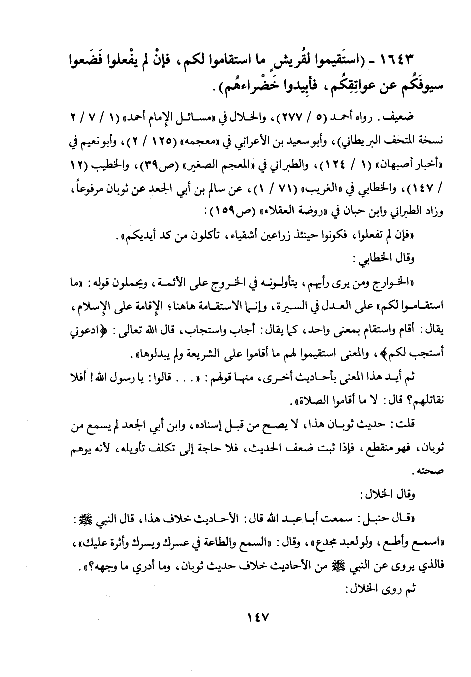 قلت: حديث ثوبان هذا، لا يصح من قبل إسناده، وابن أبي الجعد لم يسمع من ثوبان، فهو منقطع، فإذا ثبت ضعف الحديث، فلا حاجة إلى تكلف تأويله، لأنه يوهم صحته. وقال الخلال: " قال حنبل: سمعت أبا عبد الله قال: الأحاديث خلاف هذا، قال النبي صلى الله عليه وسلم: " اسمع وأطع، ولولعبد مجدع "، وقال: " السمع والطاعة في عسرك ويسرك وأثرة عليك "، فالذي يروى عن النبي صلى الله عليه وسلم من الأحاديث خلاف حديث ثوبان، وما أدري ما وجهه؟ ". ثم روى الخلال: