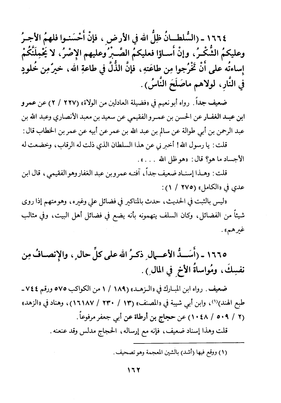 1664 - " السلطان ظل الله في الأرض، فإن أحسنوا فلهم الأجر وعليكم الشكر، وإن أساءوا فعليكم الصبر وعليهم الإصر، لا يحملنكم إساءته على أن تخرجوا من طاعته، فإن الذل في طاعة الله، خير من خلود في النار، لولاهم ما صلح الناس ".