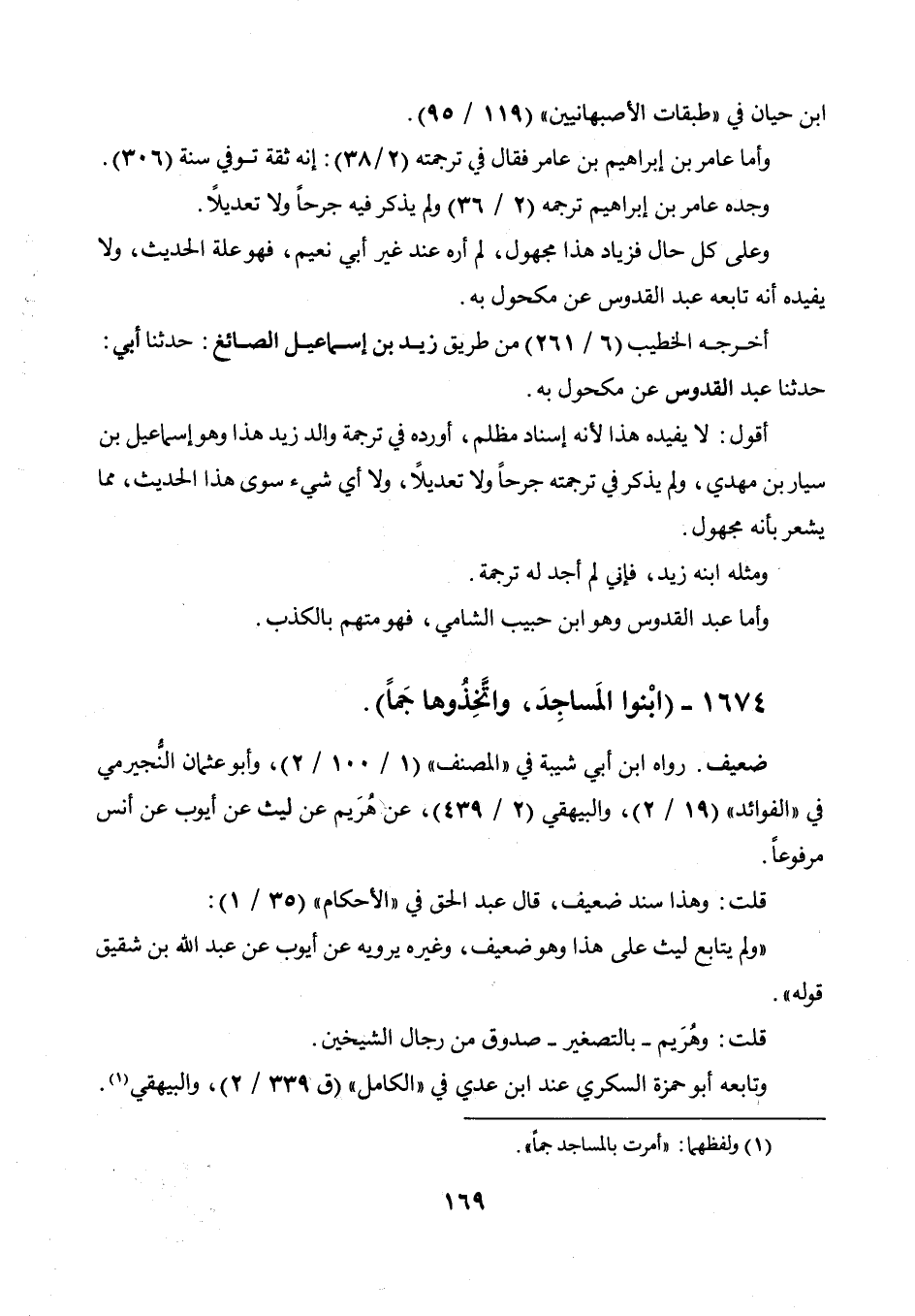 ابن حيان في " طبقات الأصبهانيين " (119 / 95) . وأما عامر بن إبراهيم بن عامر فقال في ترجمته (2 / 38) : إنه ثقة توفي سنة (306) . وجده عامر بن إبراهيم ترجمه (2 / 36) ولم يذكر فيه جرحا ولا تعديلا. وعلى كل حال فزياد هذا مجهول، لم أره عند غير أبي نعيم، فهو علة الحديث، ولا يفيده أنه تابعه عبد القدوس عن مكحول به. أخرجه الخطيب (6 / 261) من طريق زيد بن إسماعيل الصائغ: حدثنا أبي حدثنا عبد القدوس عن مكحول به.
