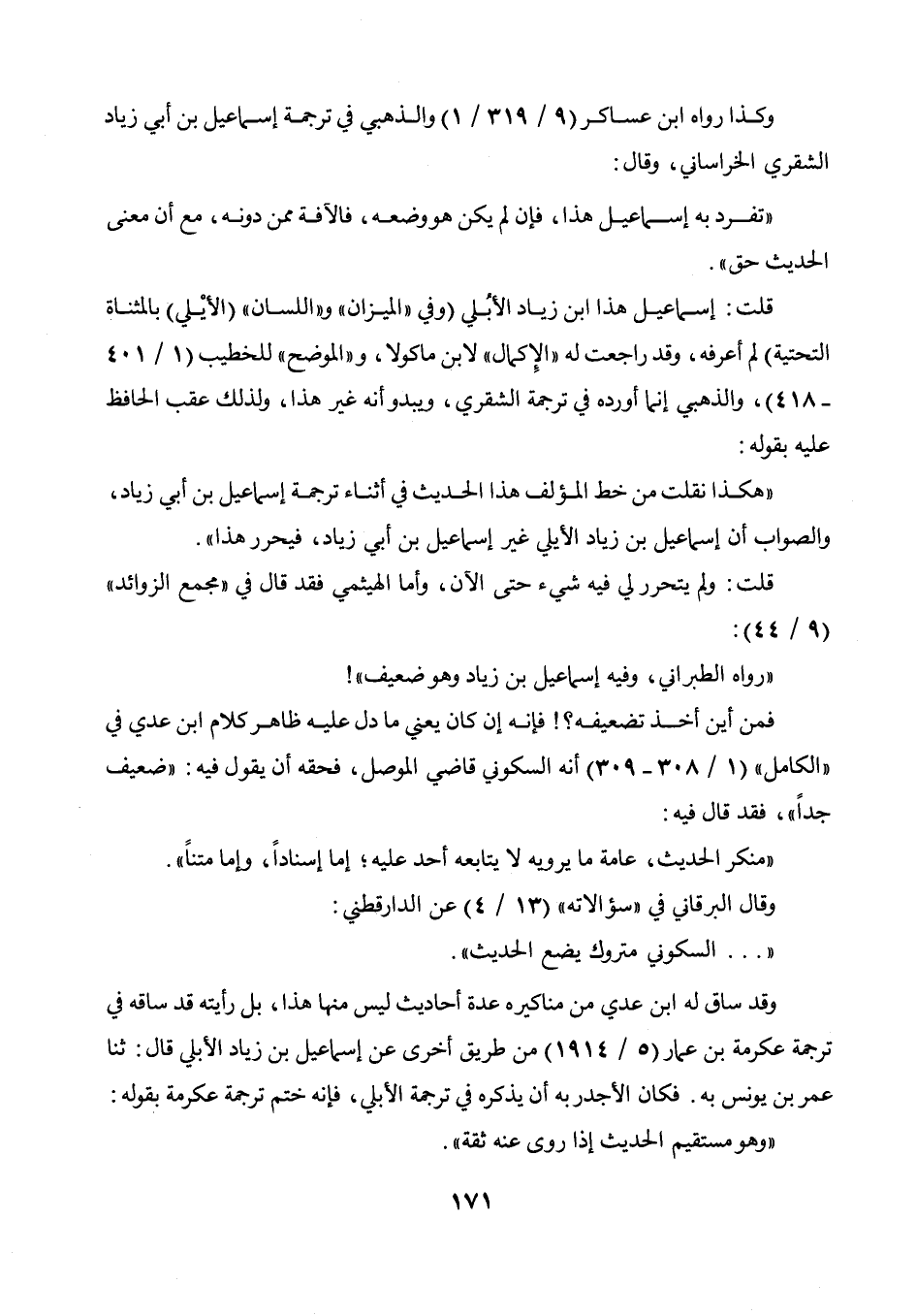 " لابن ماكولا، و" الموضح " للخطيب (1 / 401 - 418) والذهبي إنما أورده في ترجمة الشقري، ويبدو أنه غير هذا، ولذلك عقب الحافظ عليه بقوله: " هكذا نقلت من خط المؤلف هذا الحديث في أثناء ترجمة إسماعيل بن أبي زياد، والصواب أن إسماعيل بن زياد الأيلي غير إسماعيل بن أبي زياد، فيحرر هذا ".
