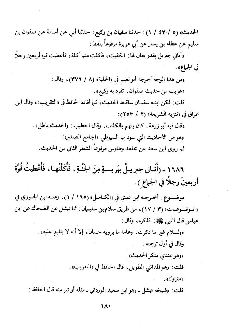 الحديث " (5 / 43 / 1) : حدثنا سفيان بن وكيع حدثنا أبي عن أسامة عن صفوان بن سليم عن عطاء بن يسار عن أبي هريرة مرفوعا بلفظ: " أتاني جبريل بقدر يقال لها: الكفيت، فأكلت منها أكلة، فأعطيت قوة أربعين رجلا في الجماع ". ومن هذا الوجه أخرجه أبو نعيم في " الحلية " (8 / 376) وقال: " غريب من حديث صفوان، تفرد به وكيع ". قلت: لكن ابنه سفيان ساقط الحديث، كما أفاده الحافظ في " التقريب "، وقال ابن عراق في " تنزيه الشريعة " (2 / 253) : " قال فيه أبو زرعة: كان يتهم بالكذب. وقال الخطيب: والحديث باطل ".