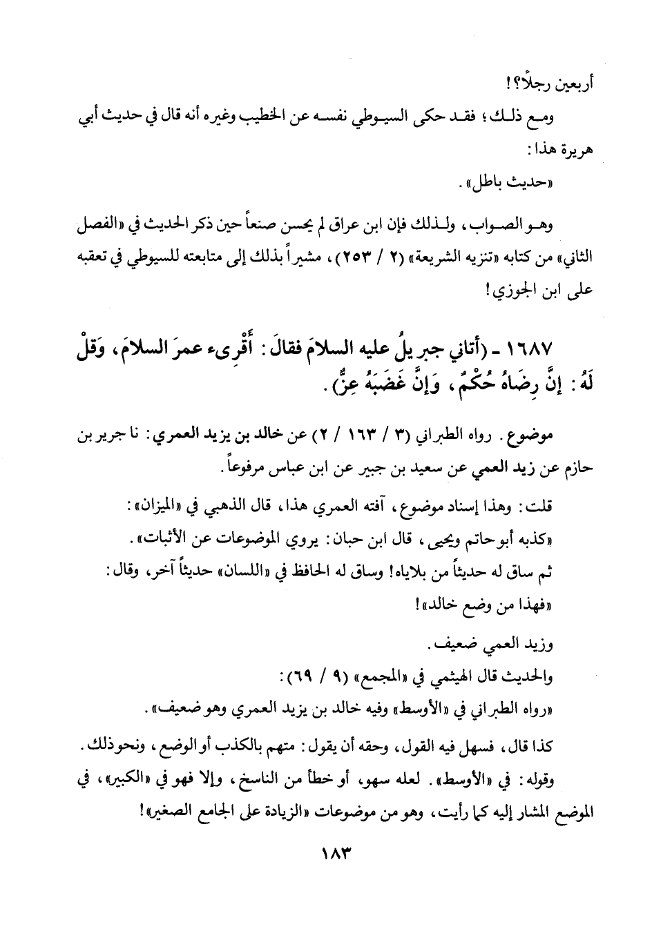 أربعين رجلا؟! ومع ذلك، فقد حكى السيوطي نفسه عن الخطيب وغيره أنه قال في حديث أبي هريرة هذا: " حديث باطل ". وهو الصواب، ولذلك فإن ابن عراق لم يحسن صنعا حين ذكر الحديث في " الفصل الثاني " من كتابه " تنزيه الشريعة " (2 / 253) مشيرا بذلك إلى متابعته للسيوطي في تعقبه على ابن الجوزي!
