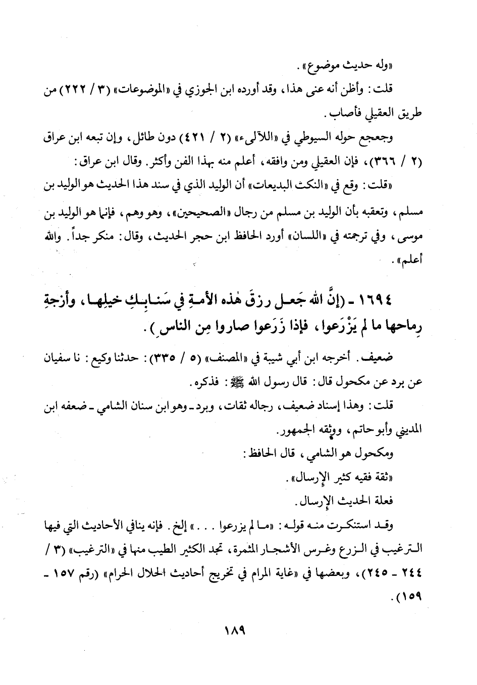 وقد استنكرت منه قوله: " ما لم يزرعوا ... " إلخ. فإنه ينافي الأحاديث التي فيها الترغيب في الزرع وغرس الأشجار المثمرة، تجد الكثير الطيب منها في " الترغيب " (3 / 244 - 245) وبعضها في " غاية المرام في تخريج أحاديث الحلال والحرام " (رقم 157 - 159) .