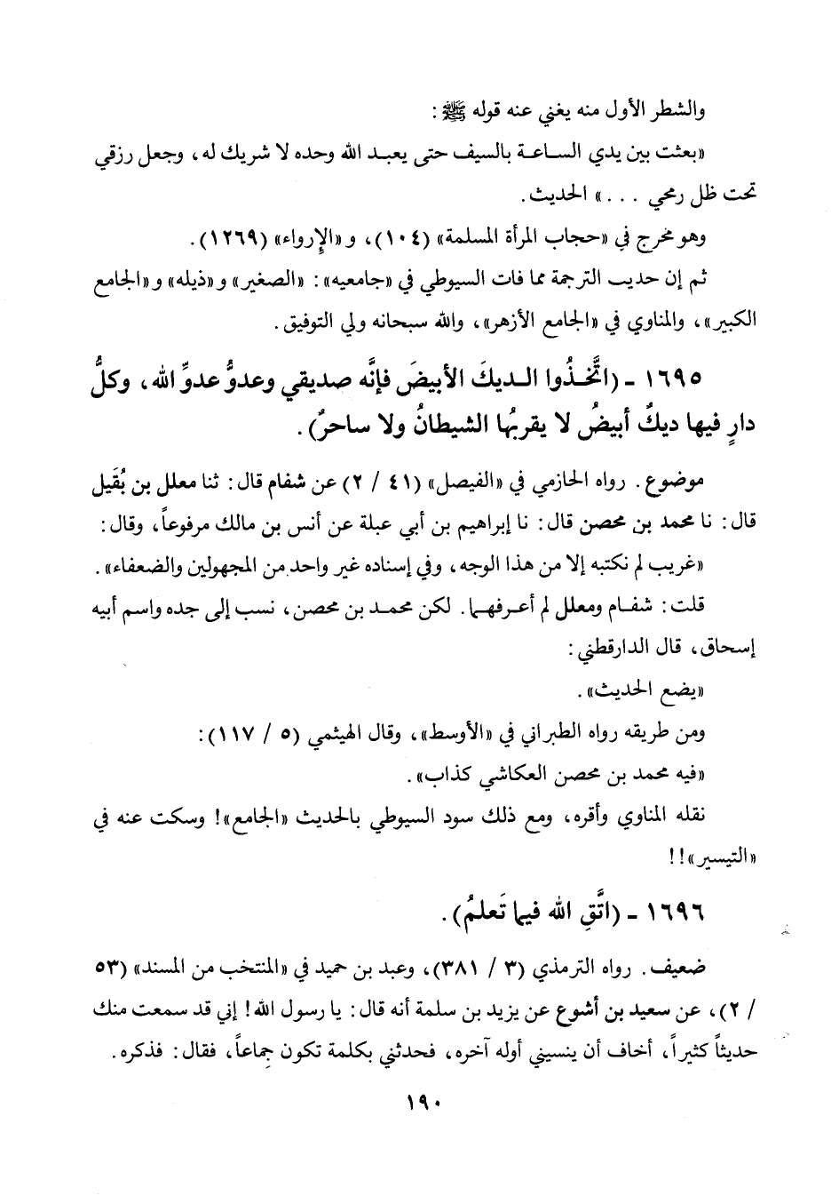 1695 - " اتخذوا الديك الأبيض فإنه صديقي وعدوعدوالله، وكل دار فيها ديك أبيض لا يقربها الشيطان ولا ساحر ".