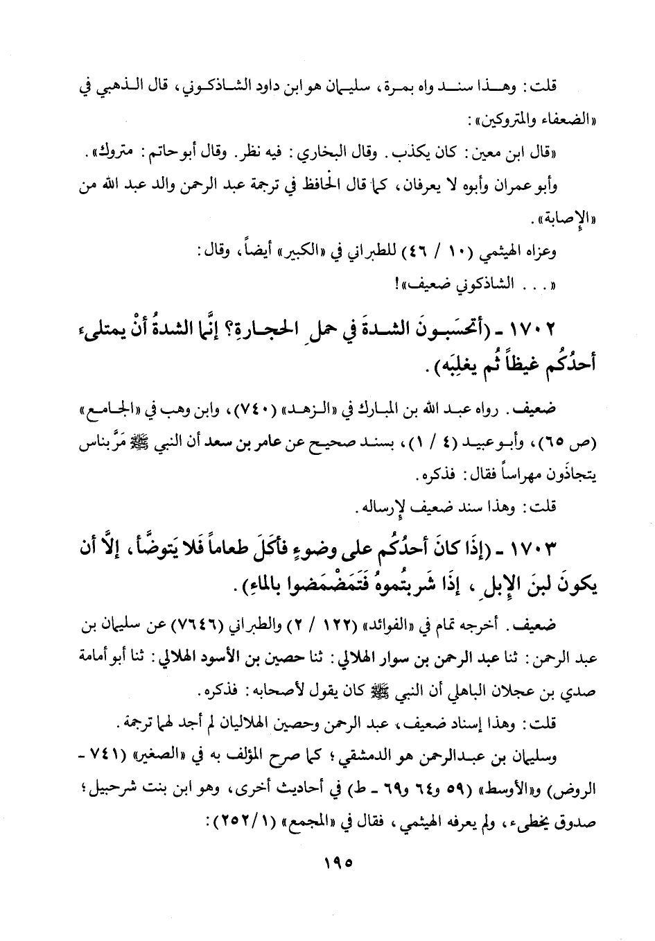 1703 - " إذا كان أحدكم على وضوء فأكل طعاما فلا يتوضأ، إلا أن يكون لبن الإبل، إذا شربتموه فتمضمضوا بالماء ".