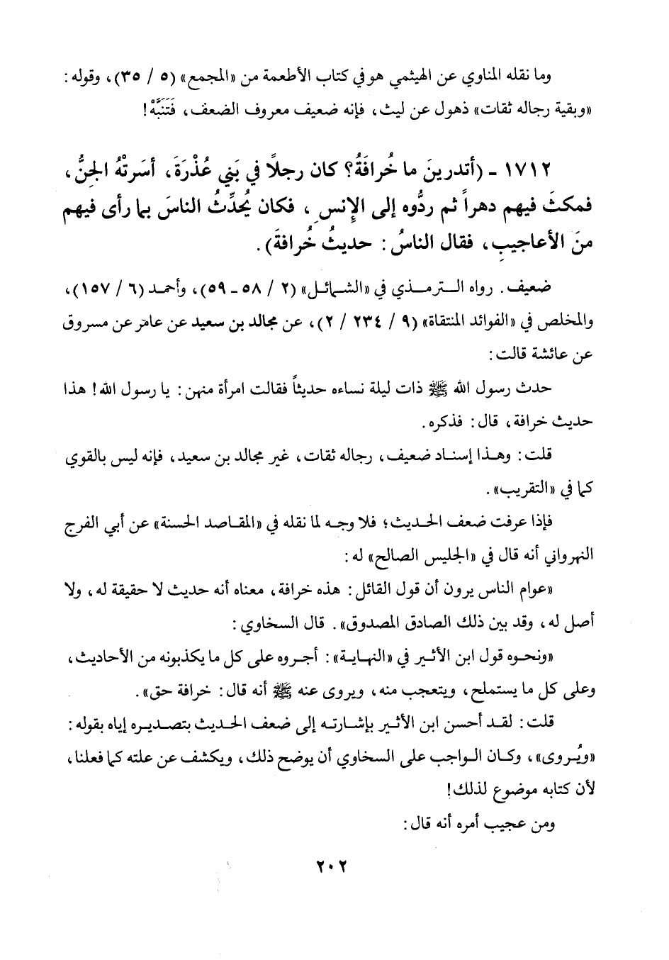 قلت: وهذا إسناد ضعيف، رجاله ثقات، غير مجالد بن سعيد، فإنه ليس بالقوي كما في " التقريب ". فإذا عرفت ضعف الحديث، فلا وجه لما نقله فيه " المقاصد الحسنة " عن أبي الفرج النهرواني أنه قال في " الجليس الصالح " له: " عوام الناس يرون أن قول القائل هذه خرافة، معناه أنه حديث لا حقيقة له، ولا أصل له وقد بين ذلك الصادق المصدوق ".
