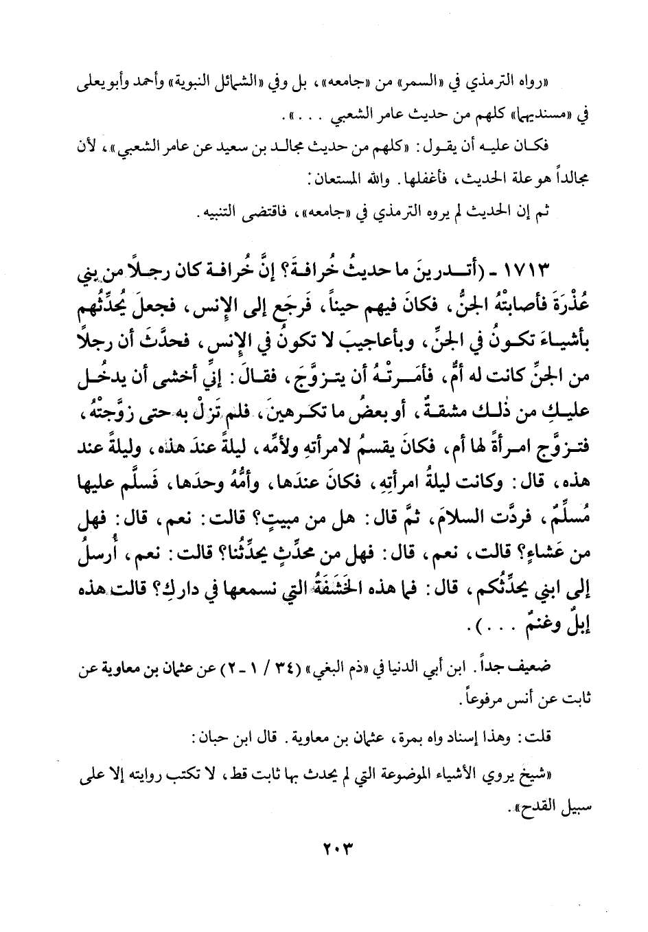 1713 - " أتدرين ما حديث خرافة؟ إن خرافة كان رجلا من بني عذرة فأصابته الجن فكان فيهم حينا، فرجع إلى الإنس، فجعل يحدثهم بأشياء تكون في الجن، وبأعاجيب لا تكون في الإنس، فحدث أن رجلا من الجن كانت له أم، فأمرته أن يتزوج، فقال: إني أخشى أن يدخل عليك من ذلك مشقة أوبعض ما تكرهين، فلم تزل به حتى زوجته، فتزوج امرأة لها أم، فكان يقسم لامرأته ولأمه، ليلة عند هذه، وليلة عند هذه، قال: وكانت ليلة امرأته، فكان عندها، وأمه وحدها، فسلم عليها مسلم، فردت السلام ثم قال: هل من مبيت؟ قالت: نعم، قال: فهل من عشاء؟ قالت: نعم، قال: فهل من محدث يحدثنا؟ قالت: نعم، أرسل إلى ابني يحدثكم، قال: فما هذه الخشفة التي نسمعها في دارك؟ قالت: هذه إبل وغنم ... ".