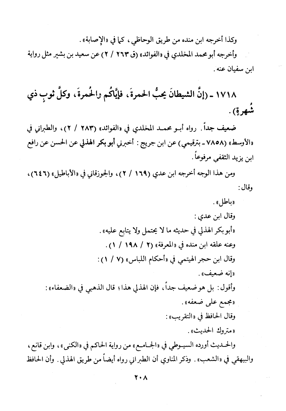 1718 - " إن الشيطان يحب الحمرة، فإياكم والحمرة، وكل ثوب ذي شهرة ".