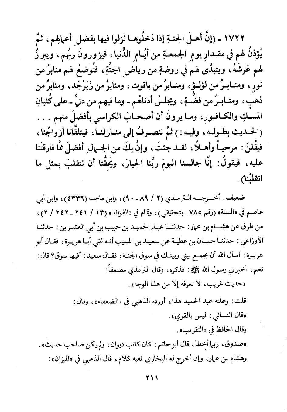 1722 - " إن أهل الجنة إذا دخلوها نزلوا فيها بفضل أعمالهم، ثم يؤذن لهم في مقدار يوم الجمعة من أيام الدنيا، فيزورون ربهم، ويبرز لهم عرشه، ويتبدى لهم في روضة من رياض الجنة، فتوضع لهم منابر من نور ومنابر من لؤلؤ ومنابر من ياقوت ومنابر من زبرجد ومنابر من ذهب ومنابر من فضة، ويجلس أدناهم - وما فيهم من دني - على كثبان المسك والكافور، وما يرون أن أصحاب الكراسي بأفضل منهم ... (الحديث بطوله، وفيه:) ثم ننصرف إلى منازلنا، فيتلقانا أزواجنا، فيقلن: مرحبا وأهلا، لقد جئت، وإن بك من الجمال أفضل مما فارقتنا عليه، فيقول: إنا جالسنا اليوم ربنا الجبار، ويحقنا أن ننقلب بمثل ما انقلبنا ".