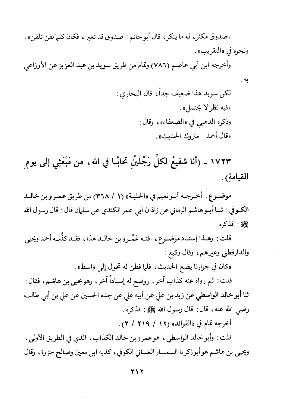 قلت: ثم رواه عنه كذاب آخر، ووضع له إسنادا آخر، وهو يحيى بن هاشم، فقال: حدثنا أبو خالد الواسطي عن زيد بن علي عن أبيه علي عن جده الحسين عن علي بن أبي طالب رضي الله عنه، قال: قال رسول الله صلى الله عليه وسلم: فذكره. أخرجه تمام في " الفوائد " (12 / 219 / 2) . قلت: وأبو خالد الواسطي، هو عمرو بن خالد الكذاب، الذي في الطريق الأولى، ويحيى بن هاشم هو أبو زكريا السمسار الغساني الكوفي، كذبه ابن معين وصالح جزرة، وقال