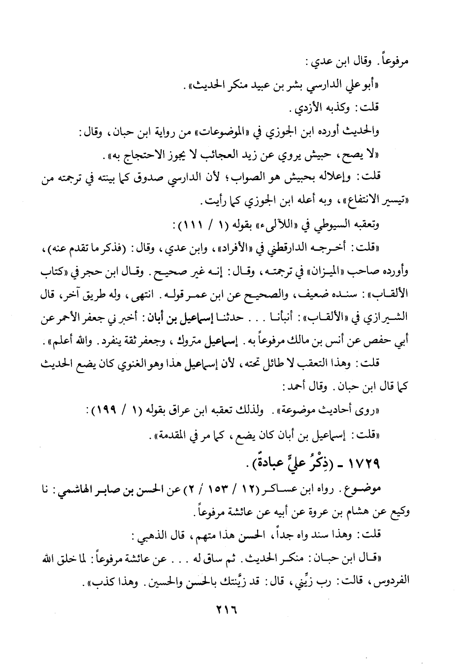 قلت: وهذا التعقب لا طائل تحته، لأن إسماعيل هذا وهو الغنوي كان يضع الحديث كما قال ابن حبان. وقال أحمد: " روى أحاديث موضوعة ". ولذلك تعقبه ابن عراق بقوله (1 / 199) : " قلت: إسماعيل بن أبان كان يضع، كما مر في المقدمة ".