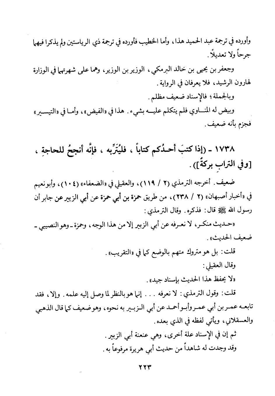 وأورده في ترجمة عبد الحميد هذا، وأما الخطيب فأورده في ترجمة ذي الرياستين ولم يذكرا فيهما جرحا ولا تعديلا. وجعفر بن يحيى بن خالد البرمكي، الوزير بن الوزير، وهما على شهرتهما في الوزارة لهارون الرشيد، فلا يعرفان في الرواية. وبالجملة، فالإسناد ضعيف مظلم. وبيض له المناوي فلم يتكلم عليه بشيء. هذا في " الفيض "، وأما في " التيسير " فجزم بأنه ضعيف.