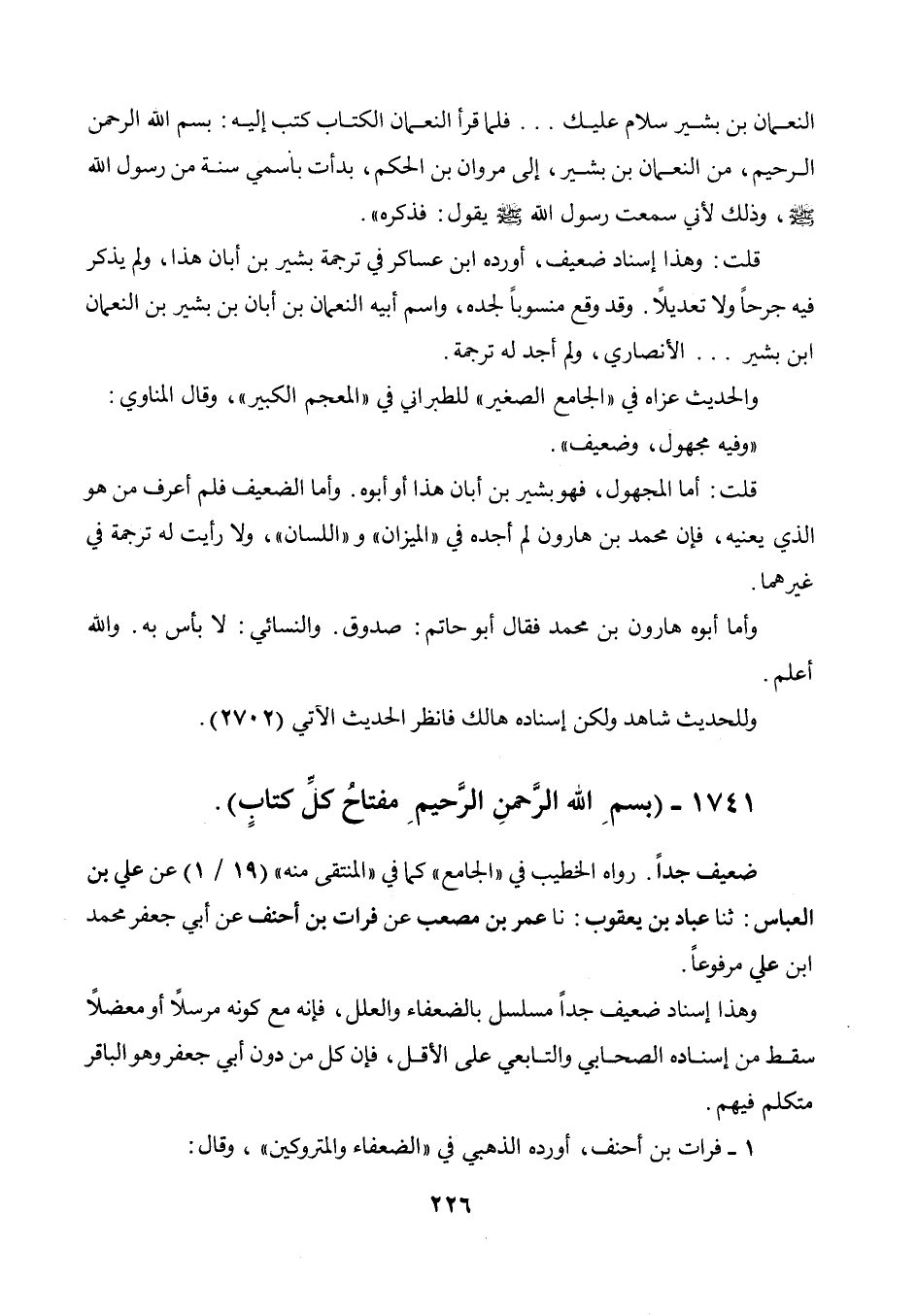 النعمان بن بشير سلام عليكم ... فلما قرأ النعمان الكتاب كتب إليه: بسم الله الرحمن الرحيم، من النعمان بن بشير إلى مروان بن الحكم، بدأت باسمي سنة من رسول الله صلى الله عليه وسلم، وذلك لأني سمعت رسول الله صلى الله عليه وسلم يقول: فذكره ". قلت: وهذا إسناد ضعيف، أورده ابن عساكر في ترجمة بشير بن أبان هذا، ولم يذكر فيه جرحا