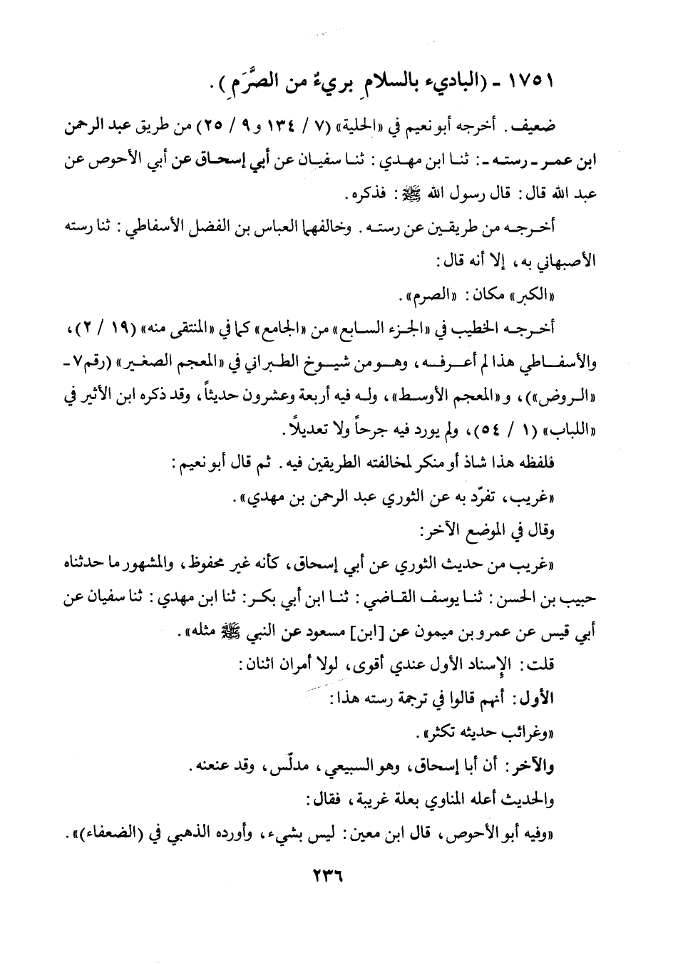شاذ أومنكر لمخالفته الطريقين فيه. ثم قال أبو نعيم: " غريب، تفرد به عن الثوري عبد الرحمن بن مهدي ". وقال في الموضع الآخر: " غريب من حديث الثوري عن أبي إسحاق، كأنه غير محفوظ، والمشهور ما حدثناه حبيب بن الحسن: حدثنا يوسف القاضي حدثنا ابن أبي بكر حدثنا ابن مهدي حدثنا سفيان عن أبي قيس عن عمروبن ميمون عن [ابن] مسعود عن النبي صلى الله عليه وسلم مثله ".