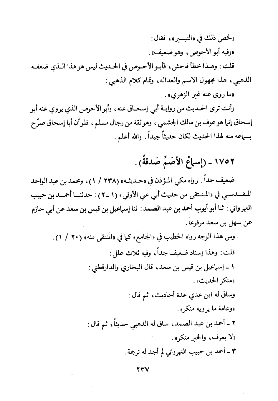 ولخص ذلك في " التيسير "، فقال: " وفيه أبو الأحوص، وهو ضعيف ". قلت: وهذا خطأ فاحش، فأبو الأحوص في الحديث ليس هو الذي ضعفه الذهبي، هذا مجهول الاسم والعدالة، وتمام كلام الذهبي: " ما روى عنه غير الزهري ". وأنت ترى الحديث من رواية أبي إسحاق عنه، وأبو الأحوص الذي يروي عنه أبو إسحاق إنما هو عوف بن مالك الجشمي، وهو ثقة من رجال مسلم، فلوأن أبا إسحاق صرح بسماعه منه لهذا الحديث لكان حديثا جيدا. والله أعلم.