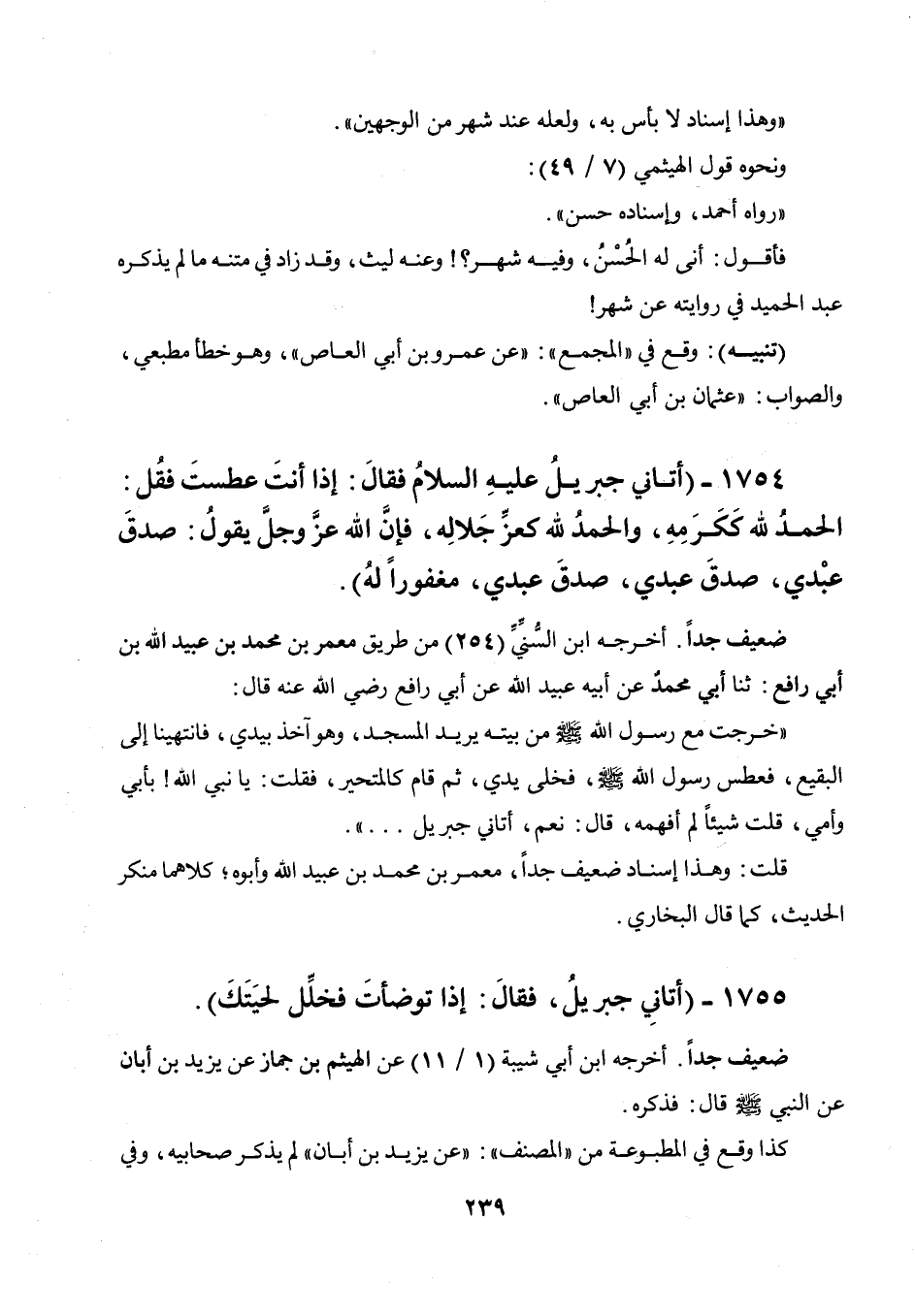 1754 - " أتاني جبريل عليه السلام فقال: إذا أنت عطست فقل: الحمد لله ككرمه، والحمد لله كعز جلاله، فإن الله عز وجل يقول: صدق عبدي، صدق عبدي، صدق عبدي، مغفورا له ".