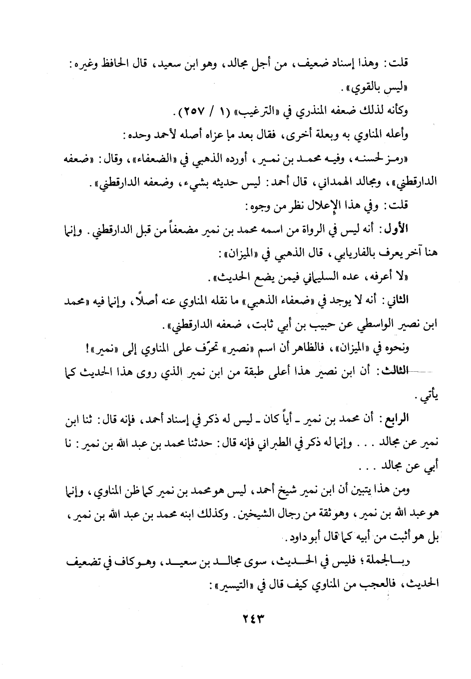 الثاني: أنه لا يوجد في " ضعفاء الذهبي " ما نقله المناوي عنه أصلا، وإنما فيه " محمد بن نصير الواسطي عن حبيب بن أبي ثابت، ضعفه الدارقطني ". ونحوه في " الميزان "، فالظاهر أن اسم " نصير " تحرف على المناوي إلى " نمير "! الثالث: أن ابن نصير هذا أعلى طبقة من ابن نمير الذي روى هذا الحديث كما يأتي.