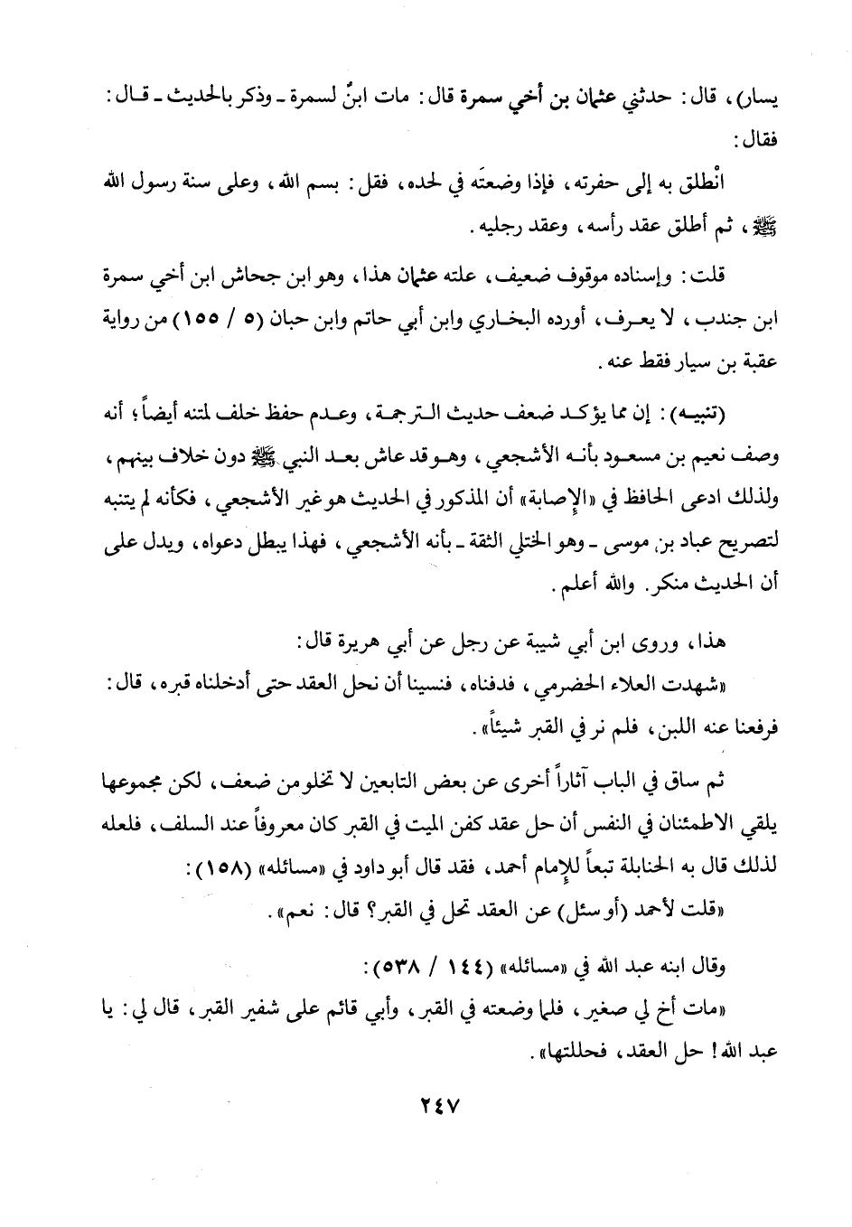 في القبر؟ قال: نعم ". وقال ابنه عبد الله في " مسائله " (144 / 538) : " مات أخ لي صغير، فلما وضعته في القبر، وأبي قائم على شفير القبر، قال لي: يا عبد الله! حل العقد، فحللتها ".