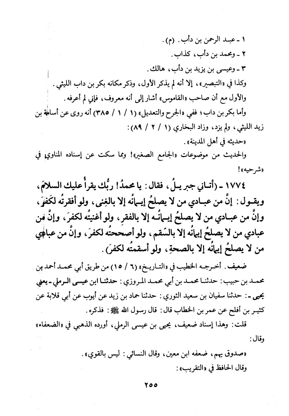 1774 - " أتاني جبريل، فقال: يا محمد! ربك يقرأ عليك السلام، ويقول: إن من عبادي من لا يصلح إيمانه إلا بالغنى، ولوأفقرته لكفر، وإن من عبادي من لا يصلح إيمانه إلا بالفقر، ولوأغنيته لكفر، وإن من عبادي من لا يصلح إيمانه إلا بالسقم، ولوأصححته لكفر، وإن من عبادي من لا يصلح إيمانه إلا بالصحة، ولوأسقمته لكفر ".