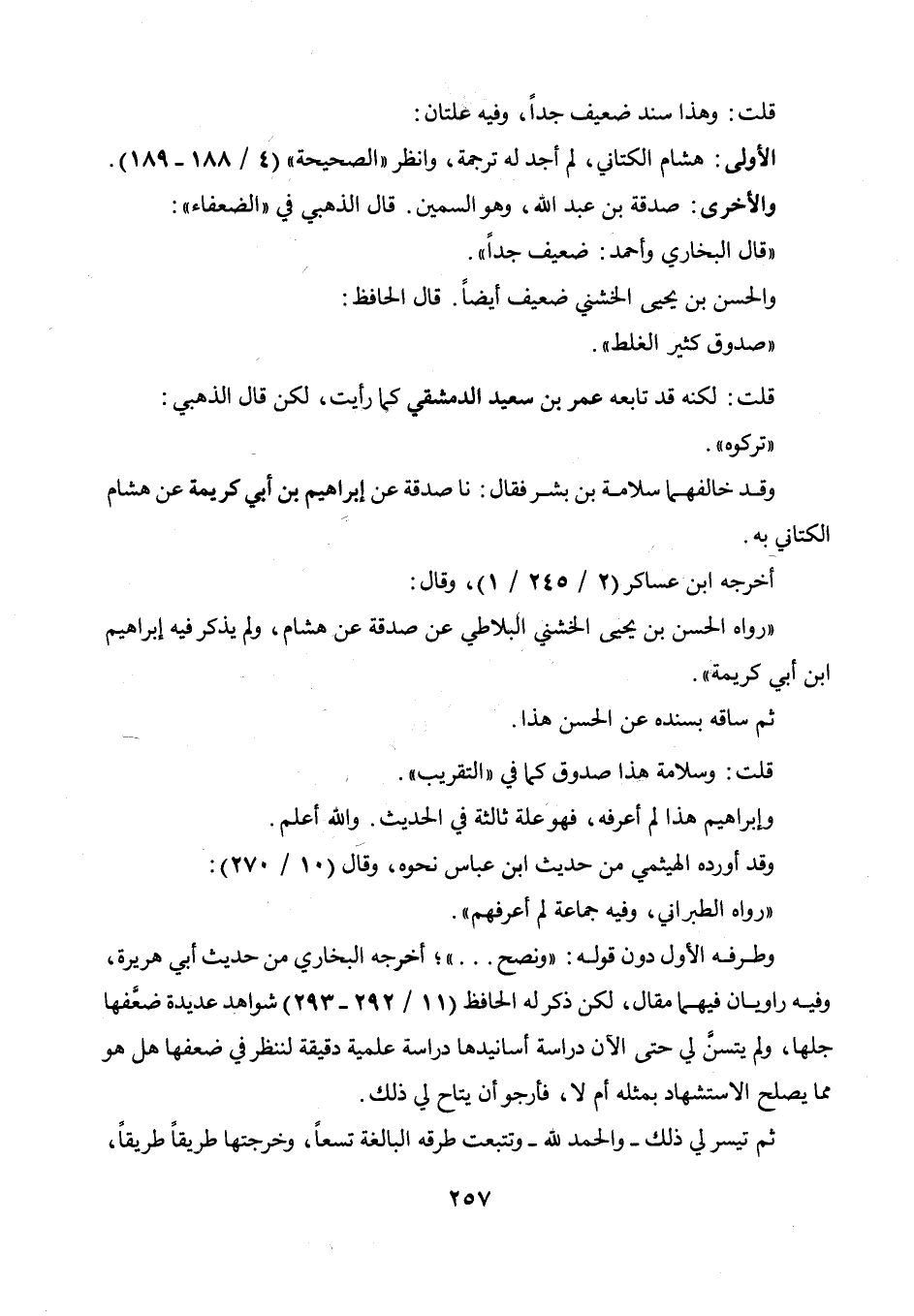 قلت: وهذا سند ضعيف جدا، وفيه علتان: الأولى: هشام الكتاني، لم أجد له ترجمة، وانظر " الصحيحة " (4 / 188 - 189) . والأخرى: صدقة بن عبد الله، وهو السمين. قال الذهبي في " الضعفاء ": " قال البخاري وأحمد: ضعيف جدا ". والحسن بن يحيى الخشني ضعيف أيضا. قال الحافظ: " صدوق كثير الغلط ". قلت: لكنه قد تابعه عمر بن سعيد الدمشقي كما رأيت، لكن قال الذهبي: " تركوه ".