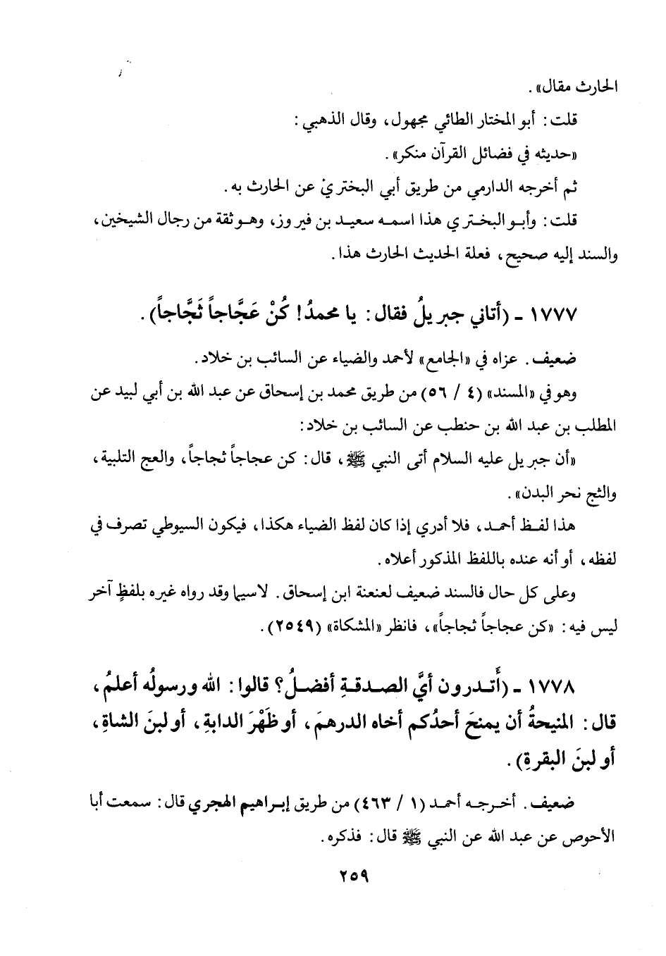 الحارث مقال ". قلت: أبو المختار الطائي مجهول، وقال الذهبي: " حديثه في فضائل القرآن منكر ". ثم أخرجه الدارمي من طريق أبي البختري عن الحارث به ". قلت: وأبو البختري هذا اسمه سعيد بن فيروز، وهو ثقة من رجال الشيخين، والسند إليه صحيح، فعلة الحديث الحارث هذا.