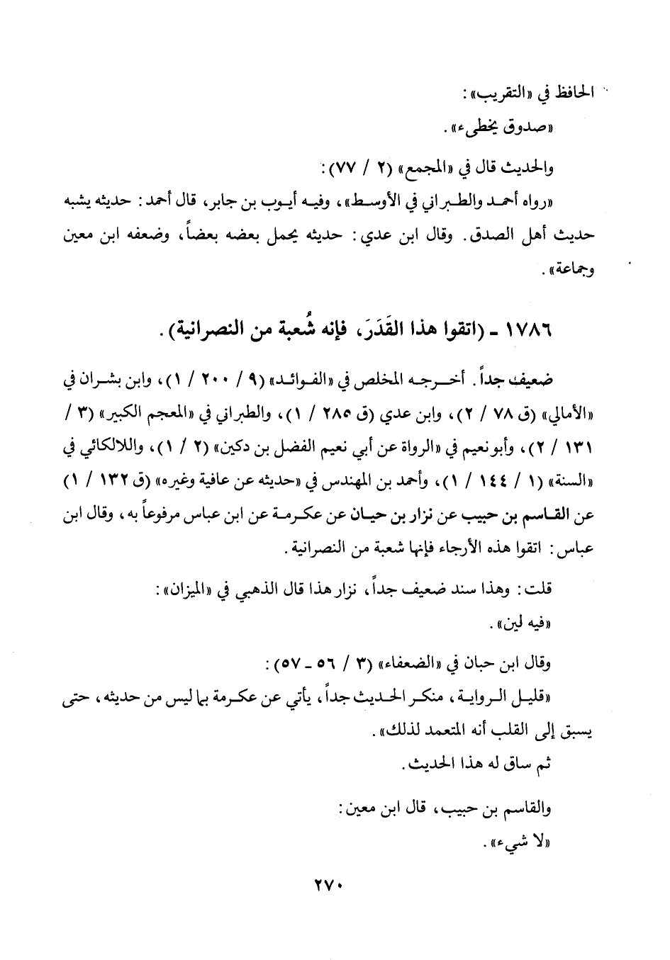 أخرجه المخلص في " الفوائد " (9 / 200 / 1) وابن بشران في " الأمالي " (ق 78 / 2) وابن عدي (ق 285 / 1) والطبراني في " المعجم الكبير " (3 / 131 / 2) وأبو نعيم في " الرواة عن أبي نعيم الفضل بن دكين " (2 / 1) واللالكائي في " السنة " (1 / 144 / 1) وأحمد بن المهندس في " حديثه عن عافية وغيره " (ق 132 / 1) عن القاسم بن حبيب عن نزار بن حيان عن عكرمة عن ابن عباس مرفوعا به، وقال ابن عباس: اتقوا هذه الأرجاء فإنها شعبة من النصرانية. قلت: وهذا سند ضعيف جدا، نزار هذا قال الذهبي في " الميزان ": " فيه لين ". وقال ابن حبان في " الضعفاء " (3 / 56 - 57) : " قليل الرواية، منكر الحديث جدا، يأتي عن عكرمة بما ليس من حديثه، حتى يسبق إلى القلب أنه المتعمد لذلك ". ثم ساق له هذا الحديث. والقاسم بن حبيب، قال ابن معين: " لا شيء ".