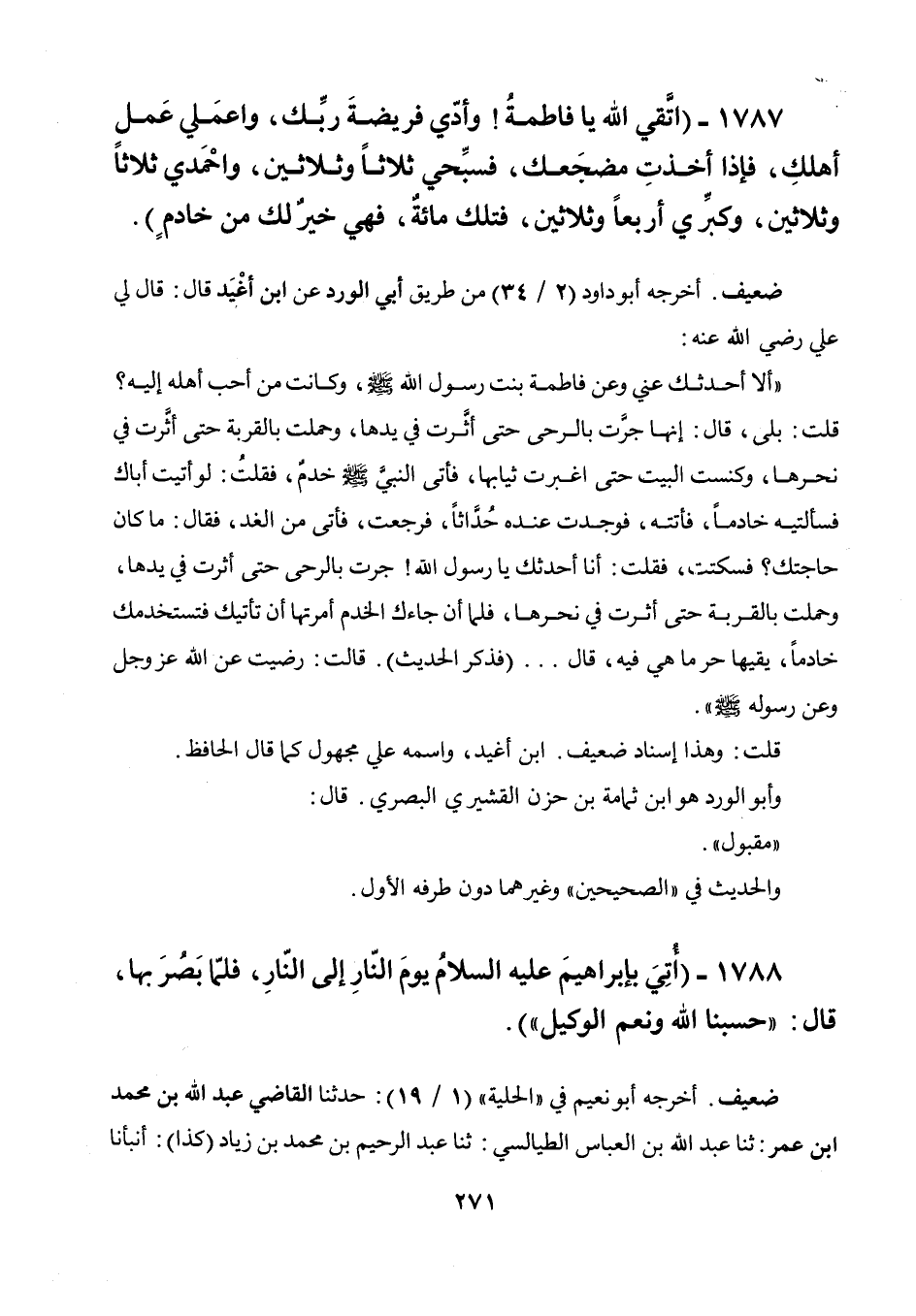 1788 - " أتي بإبراهيم عليه السلام يوم النار إلى النار، فلما بصر بها، قال: (حسبنا الله ونعم الوكيل) ".