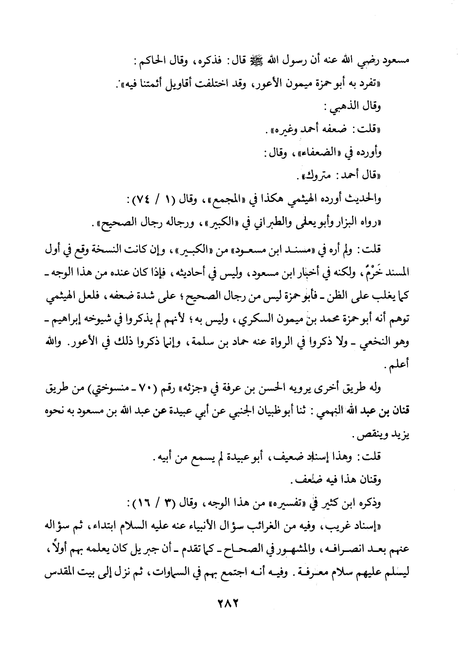 مسعود رضي الله عنه أن رسول الله صلى الله عليه وسلم قال: فذكره. وقال الحاكم: " تفرد به أبو حمزة ميمون الأعور وقد اختلفت أقاويل أئمتنا فيه ". وقال الذهبي: " قلت ضعفه أحمد وغيره ". وأورده في " الضعفاء " وقال: "