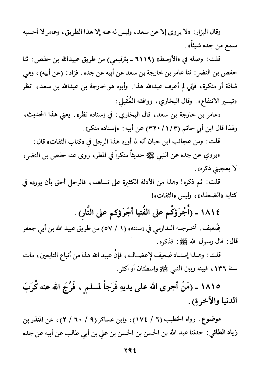 بن عبد الله بن سعد، انظر " تيسير الانتفاع ". وقال البخاري، ووافقه العقيلي: " عامر بن خارجة بن سعد، قال البخاري: في إسناده نظر ". يعني هذا الحديث، ولهذا قال ابن أبي حاتم (3 / 1 / 320) عن أبيه: " إسناده منكر ".