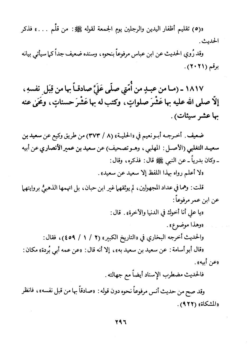 1817 - " ما من عبد من أمتي صلى علي صادقا بها من قبل نفسه، إلا صلى الله عليه بها عشر صلوات، وكتب له بها عشر حسنات، ومحى عنه بها عشر سيئات ".