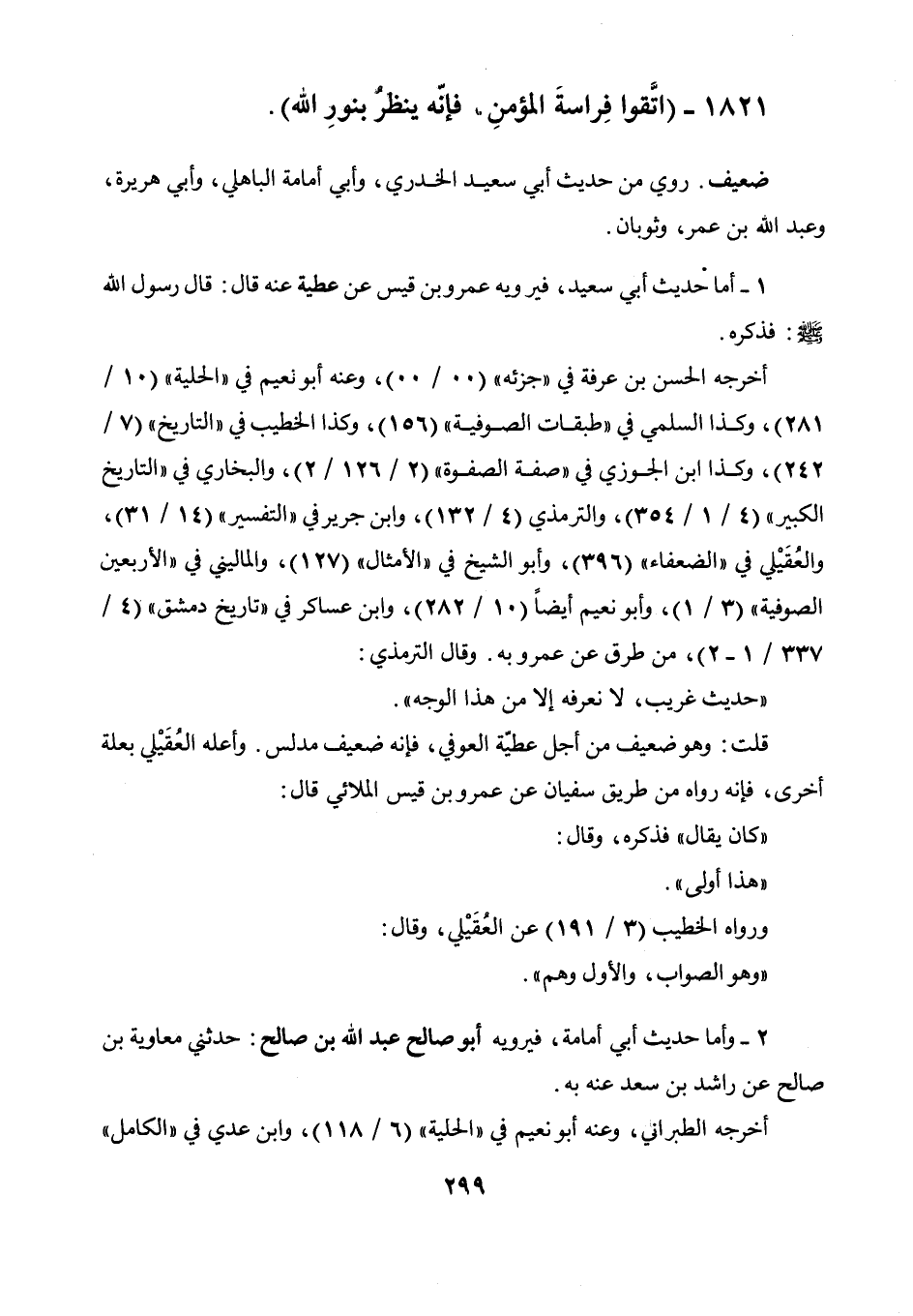 1821 - " اتقوا فراسة المؤمن، فإنه ينظر بنور الله ".