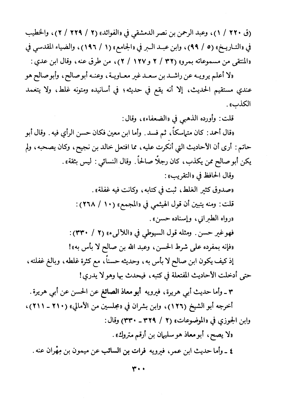 قلت: وأورده الذهبي في " الضعفاء "، وقال: " قال أحمد: كان متماسكا، ثم فسد. وأما ابن معين فكان حسن الرأي فيه. وقال أبو حاتم: أرى أن الأحاديث التي أنكرت عليه، مما افتعل خالد بن نجيح، وكان يصحبه، ولم يكن أبو صالح ممن يكذب، كان رجلا صالحا. وقال النسائي: ليس بثقة ". وقال الحافظ في " التقريب ": " صدوق كثير الغلط، ثبت في كتابه، وكانت فيه غفلة ". قلت: ومنه يتبين أن قول الهيثمي في " المجمع " (10 / 268) : " رواه الطبراني، وإسناده حسن ". فهو غير حسن. ومثله قول السيوطي في " اللآلىء " (2 / 330) : " فإنه بمفرده على شرط الحسن، وعبد الله بن صالح لا بأس به "!