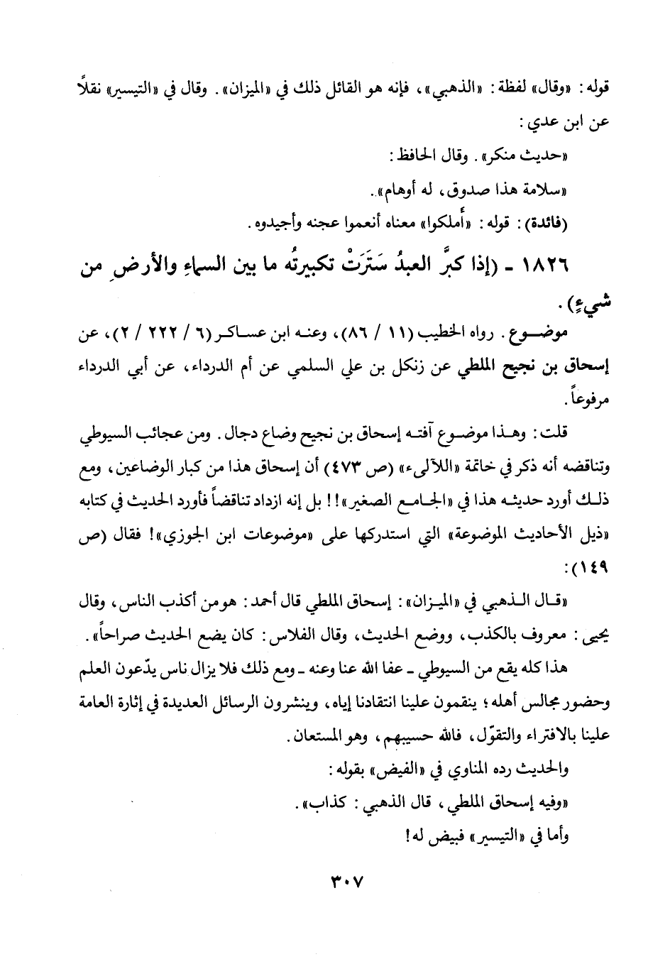 بقوله: " وفيه إسحاق الملطي، قال الذهبي: كذاب ". وأما في " التيسير