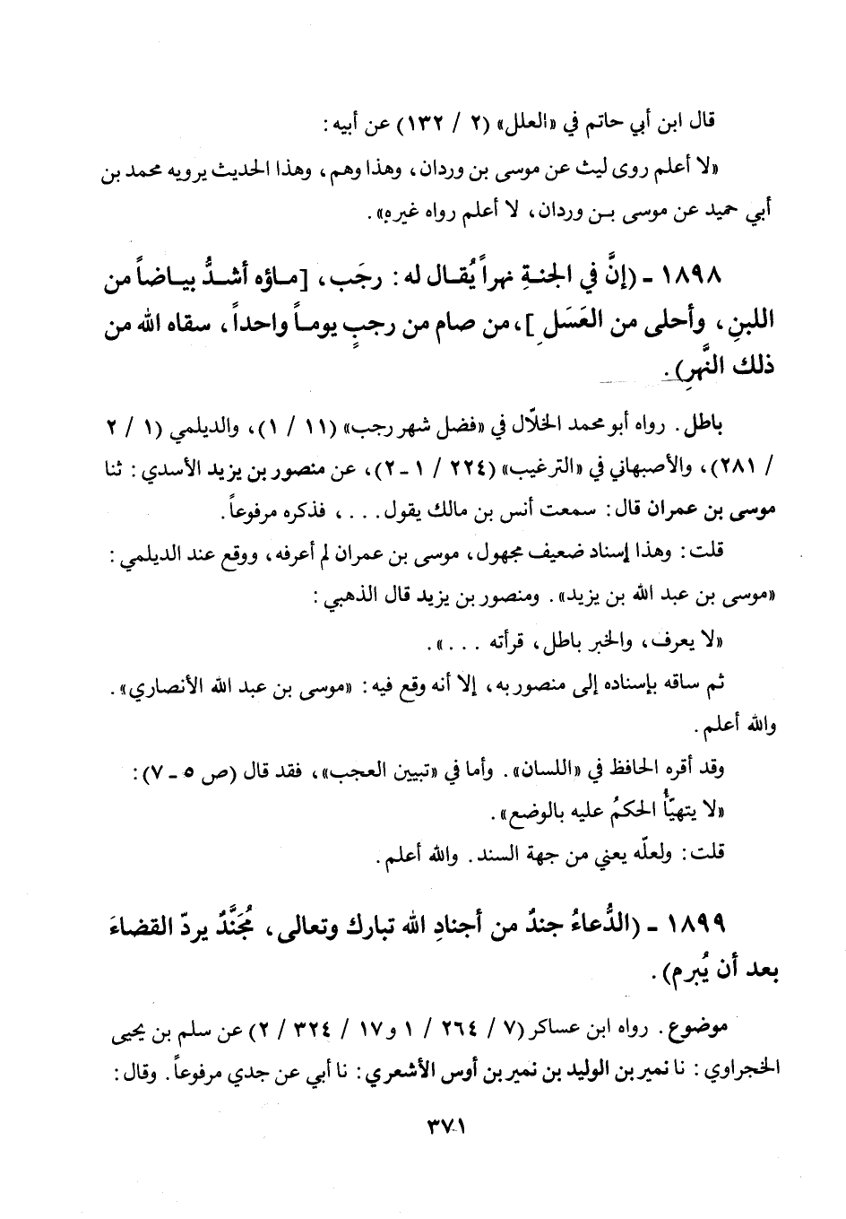 1898 - " إن في الجنة نهرا يقال له: رجب، [ماؤه أشد بياضا من اللبن، وأحلى من العسل] ، من صام من رجب يوما واحدا، سقاه الله من ذلك النهر ".