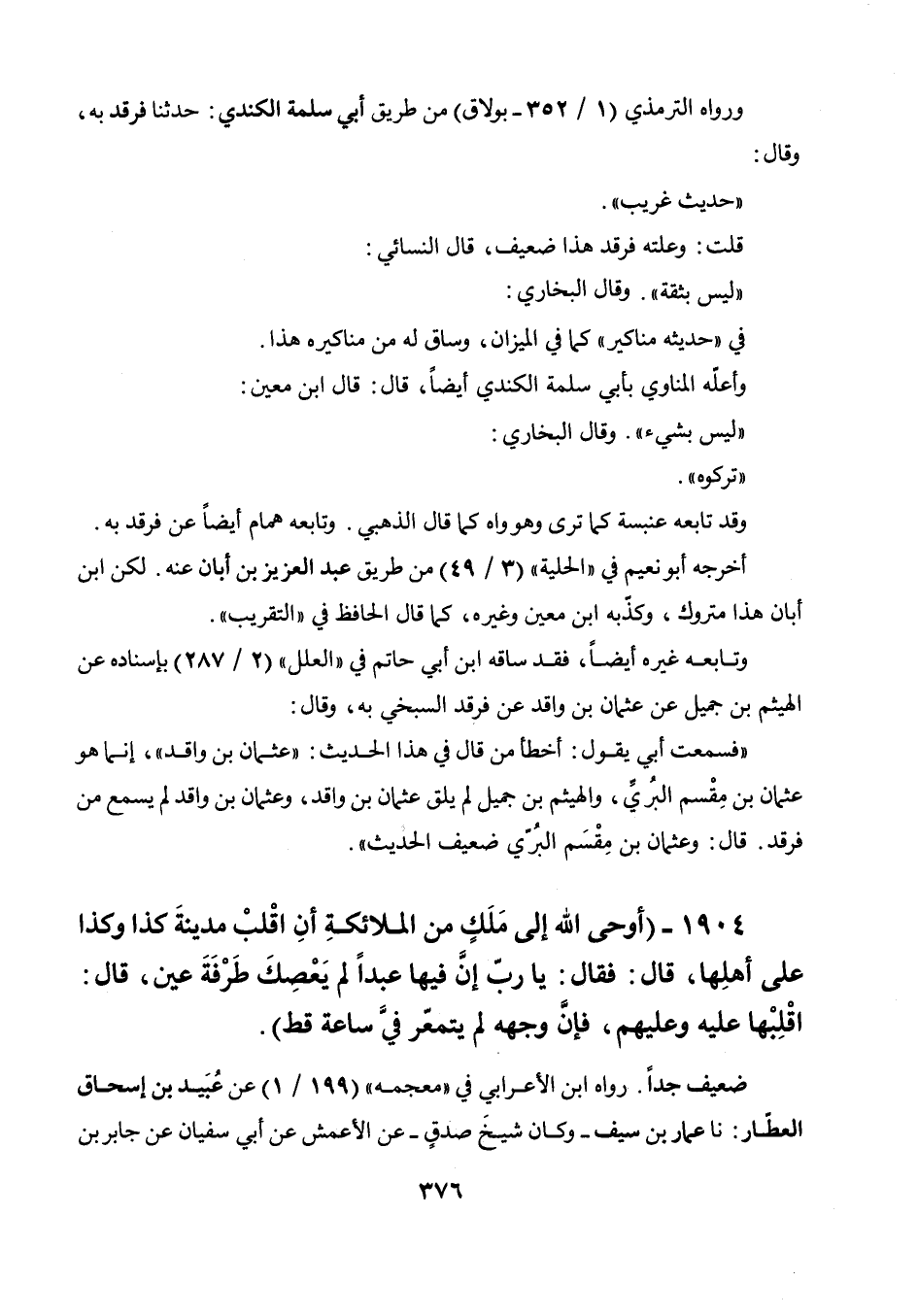 1904 - " أوحى الله إلى ملك من الملائكة أن اقلب مدينة كذا وكذا على أهلها، قال: فقال: يا رب إن فيها عبدا لم يعصك طرفة عين، قال: اقلبها عليه وعليهم، فإن وجهه لم يتمعر في ساعة قط ".